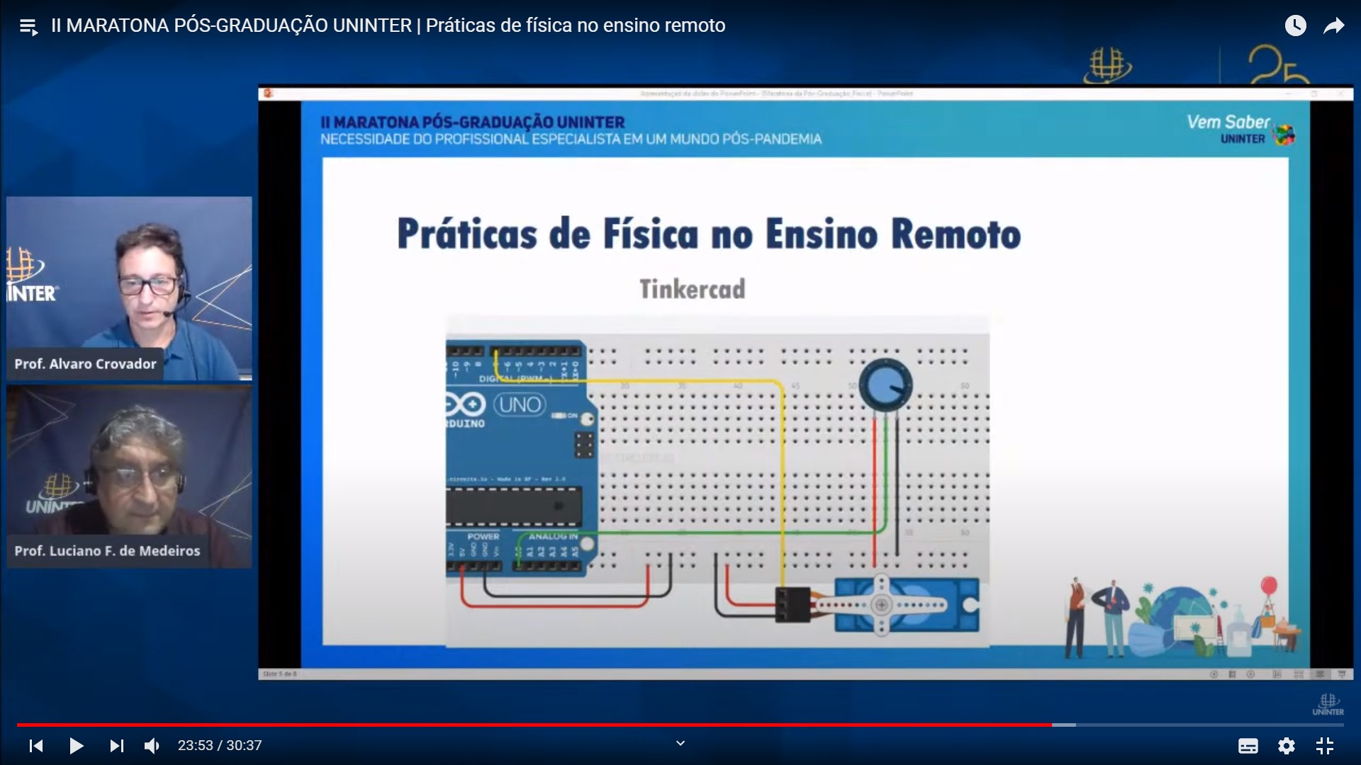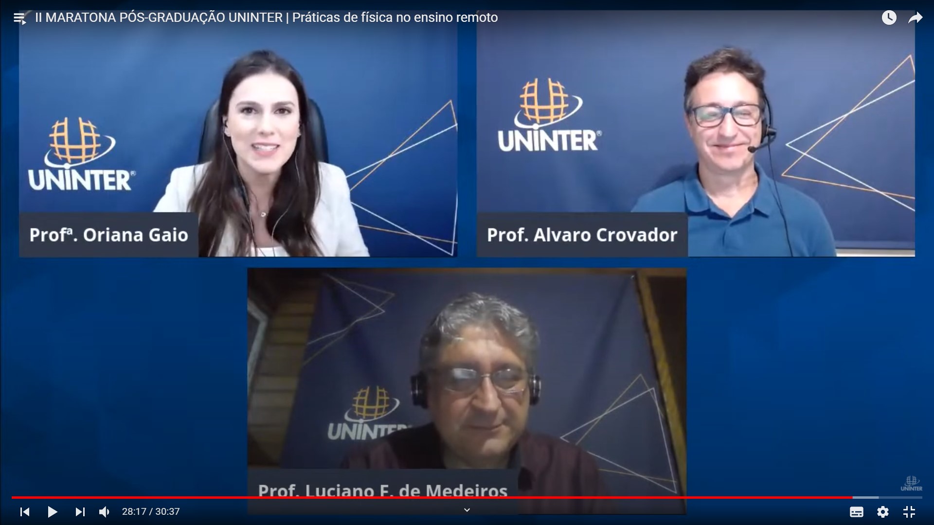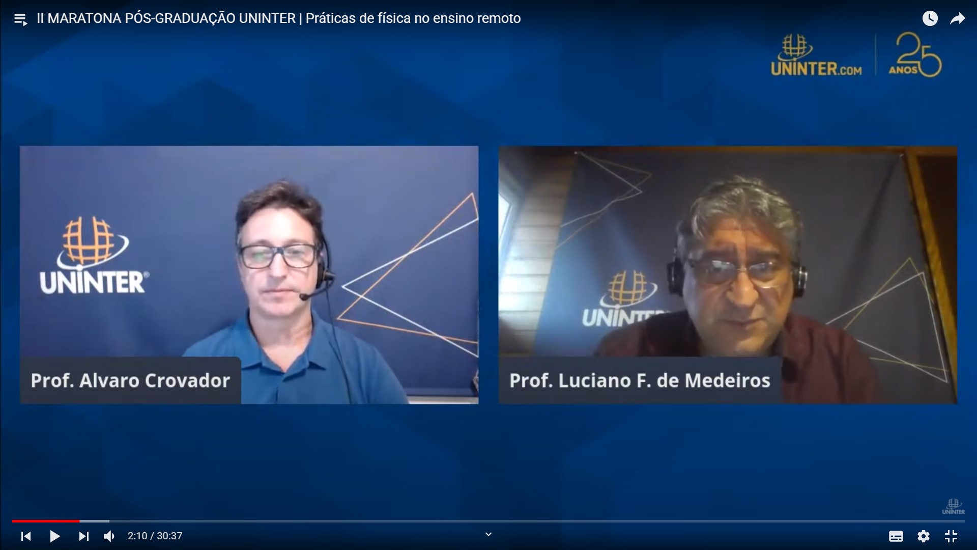Para falar sobre a importância das atividades práticas para o estudo da física no ensino remoto, a II Maratona de Pós-Graduação da Uninter, transmitida no último dia 29.mai.2021, recebeu os professores Luciano Frontino Medeiros e Alvaro Crovador. Ambos têm formação na área e defendem que na pandemia os professores devem usar a criatividade para ensinar matérias que envolvam princípios da física e cálculo. Os docentes destacam que o arduino e materiais recicláveis podem ser ótimas opções para alunos criarem experimentos em casa.
