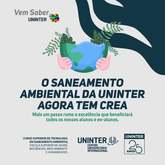 Neste mês de setembro, o Conselho Regional de Engenharia e Agronomia do Paraná (CREA) concedeu em deliberação de plenário a vinculação do curso de Saneamento Ambiental da Uninter a este conselho regulador da profissão. Assim, seus graduados podem obter registro profissional junto ao órgão.