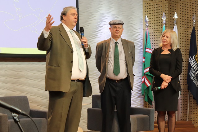 O chanceler realizou a abertura da solenidade ao lado do reitor, Benhur Gaio, e do vice-reitor e atual presidente da Fundação, Jorge Bernardi.