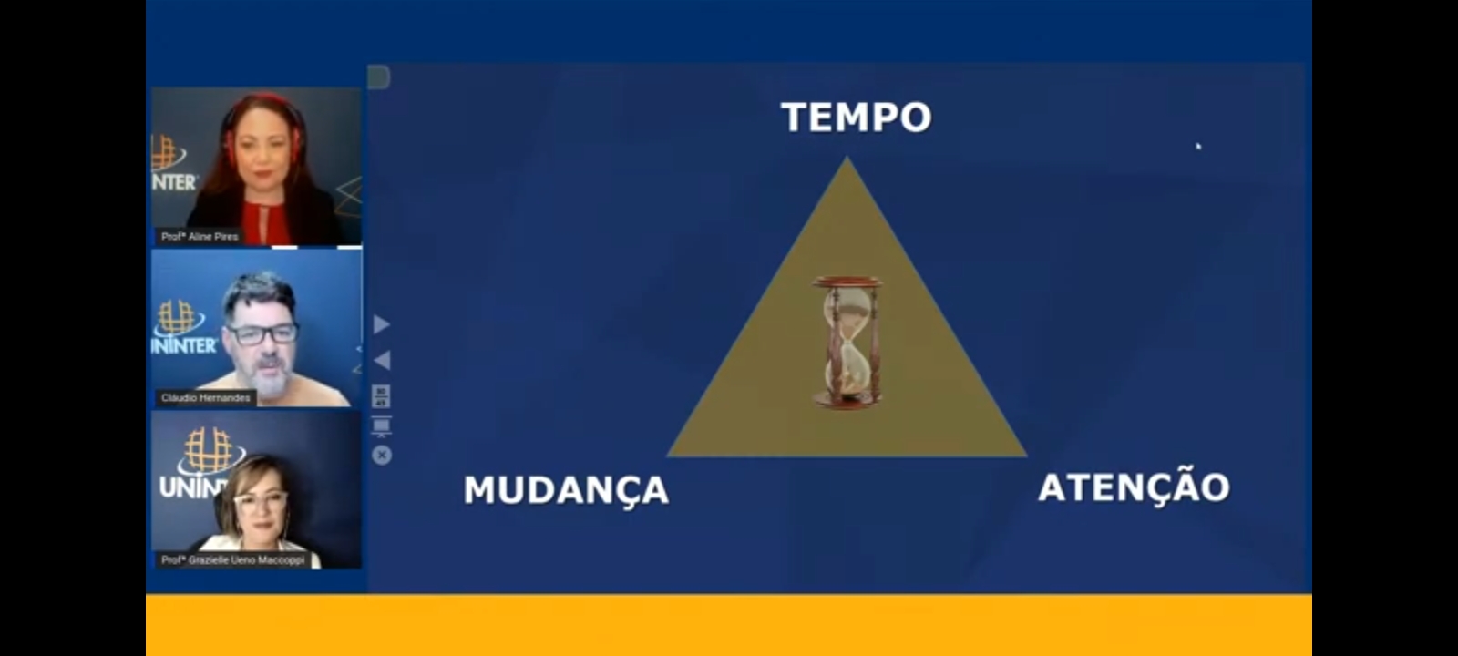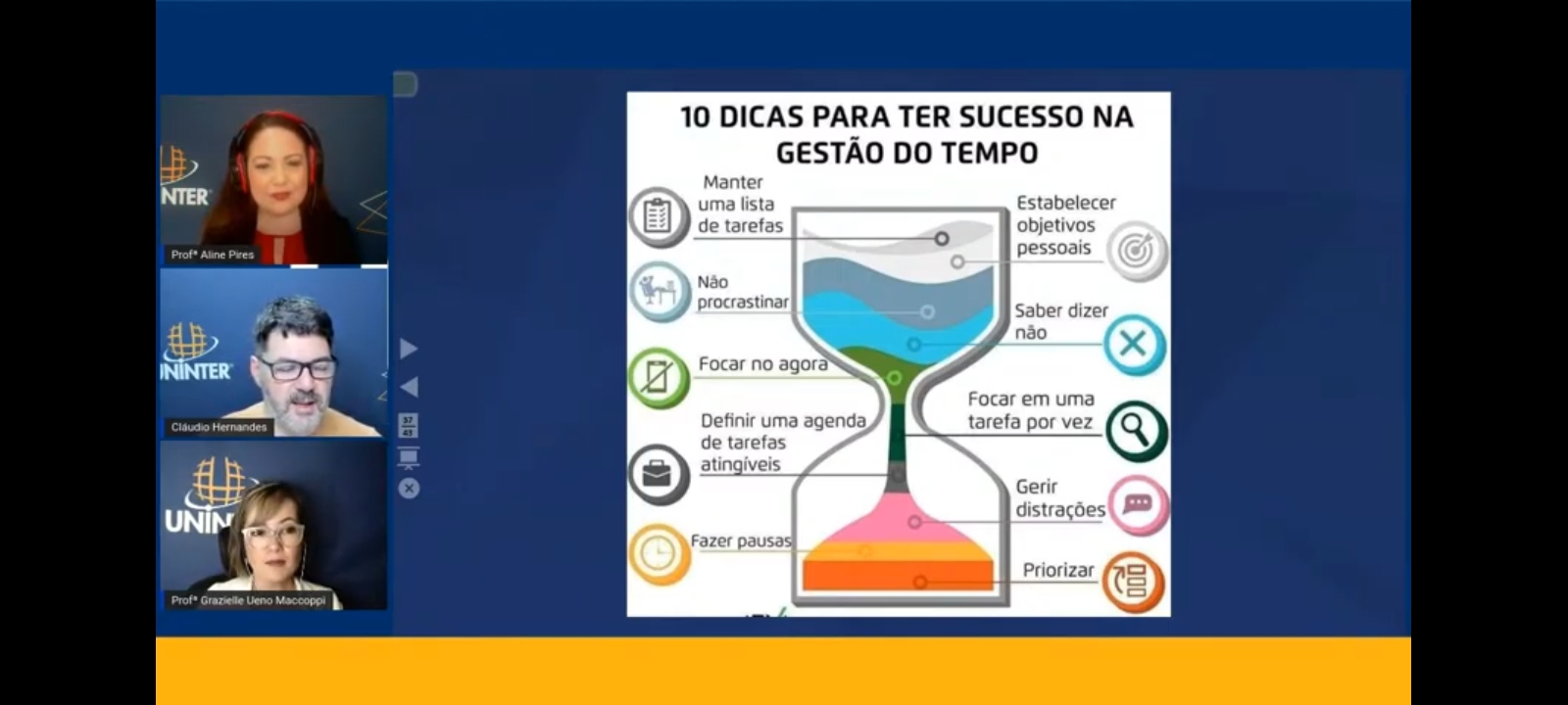 O tema “A gestão do tempo para profissionais de sucesso” foi discutido durante live da Escola Superior de Gestão, Comunicação e Negócio da Uninter. A transmissão contou com a participação dos professores Claudio Hernandes e Grazielle Ueno Maccoppi, e foi mediada pela tutora Aline Pires. Para assistir à live completa, clique aqui.