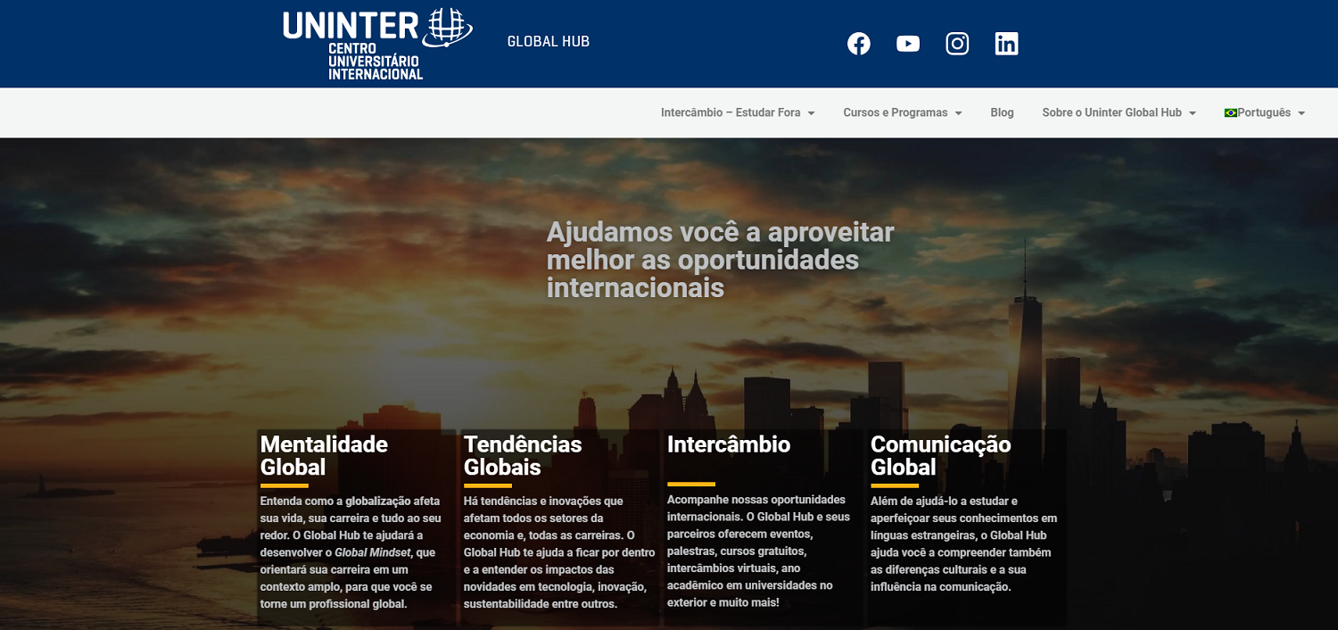 Ampliar os horizontes linguísticos e culturais dos estudantes é uma das principais propostas da Uninter para as carreiras acadêmicas e profissionais. Uma das ações de internacionalização do centro universitário é o Global Hub, criado em 2020 pela Uninter USA com a missão de ofertar experiências internacionais e trocas culturais entre alunos de diversas partes do mundo.