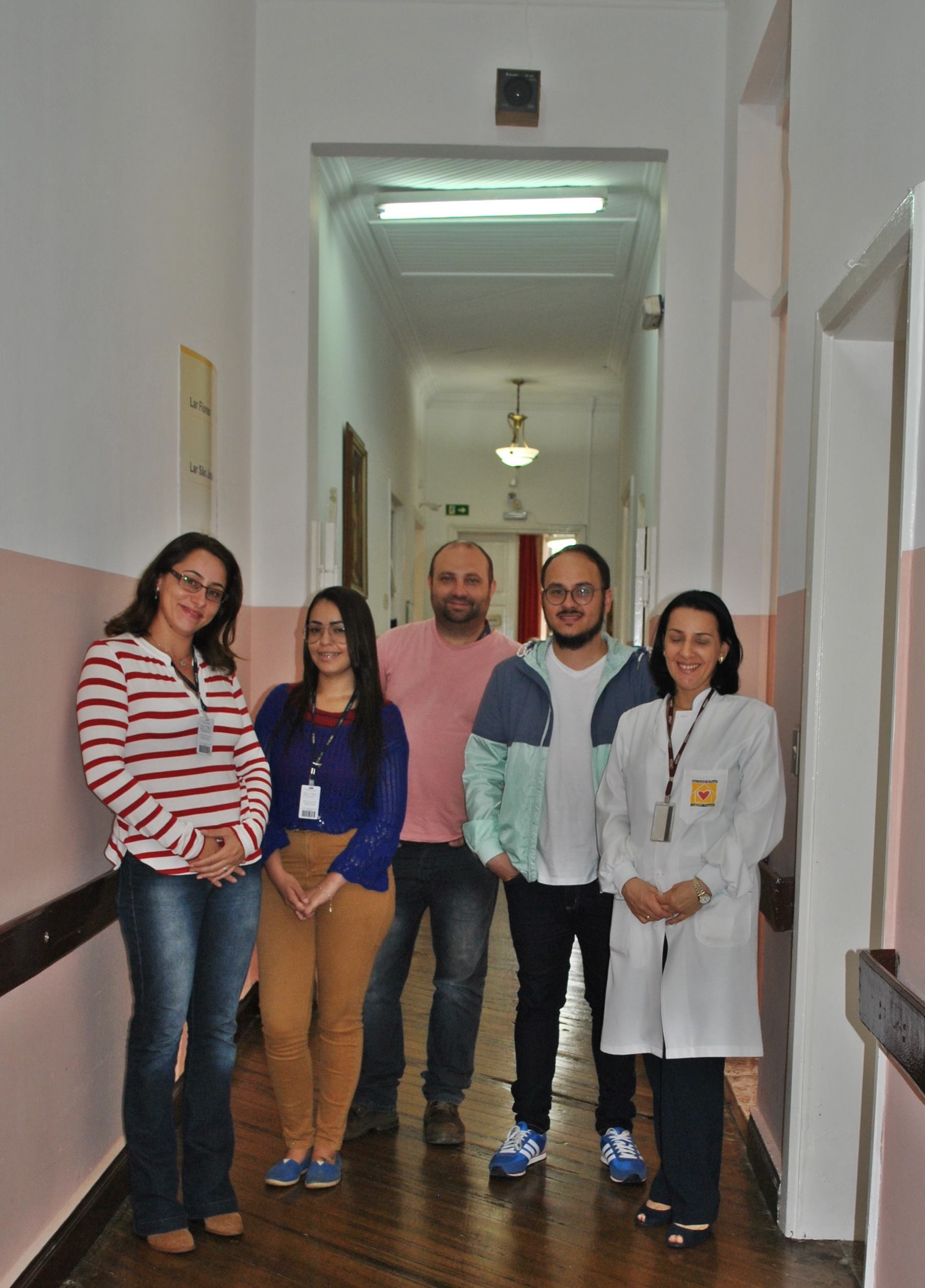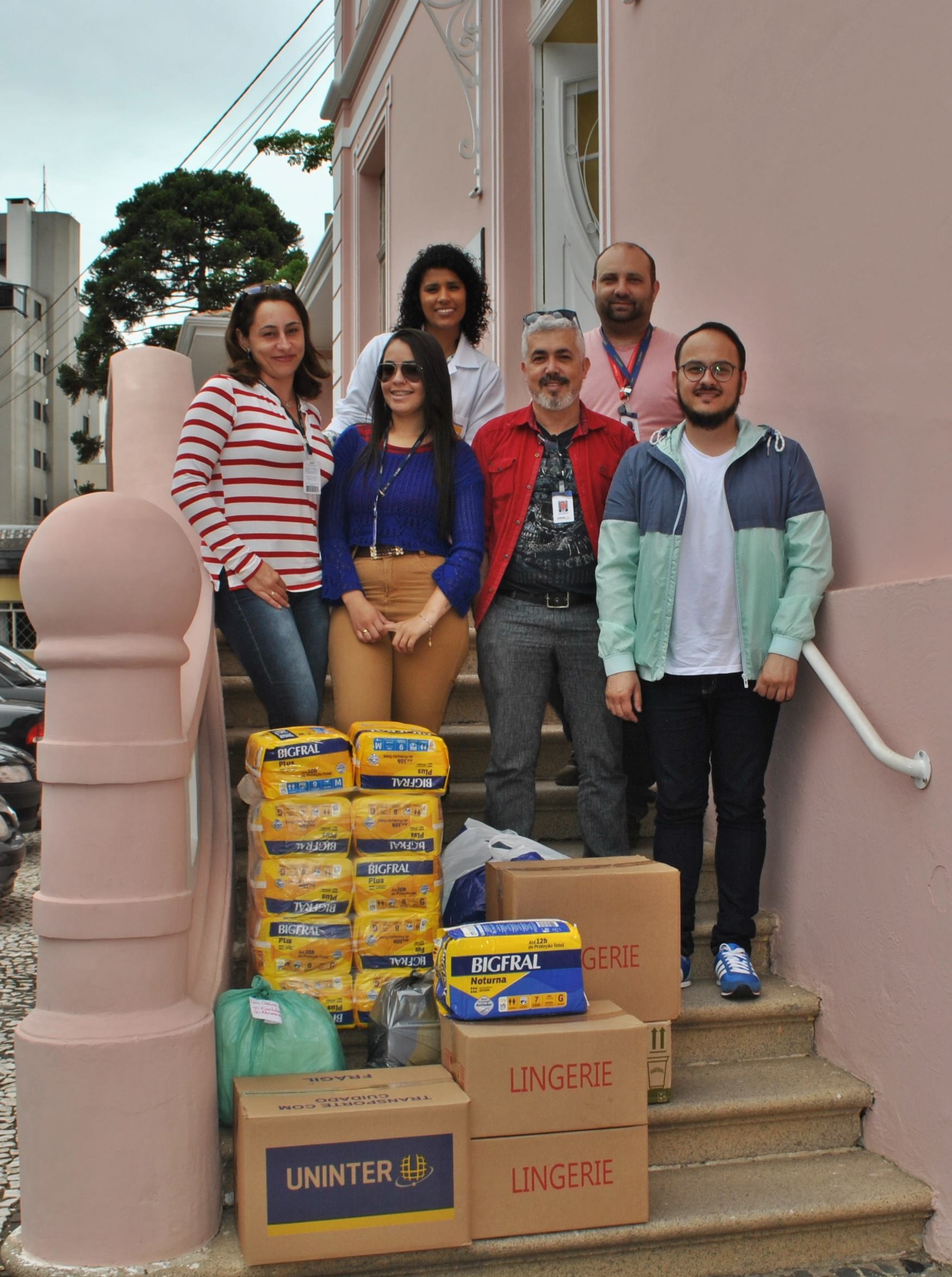 A ideia de presentear as internas do Asilo São Vicente de Paulo empolgou de auxiliares a diretores da Uninter. O material arrecadado foi entregue ao asilo nesta quinta-feira (22) por uma parte dos integrantes da equipe: Evelline Brazão, coordenadora técnica de produção, Daiane Monteiro, auxiliar administrativo de produção, Eduardo Antunes, gerente dos estúdios, Reginaldo Carvalho, supervisor de transmissão, e Guilherme Clauman, coordenador técnico de gravação.