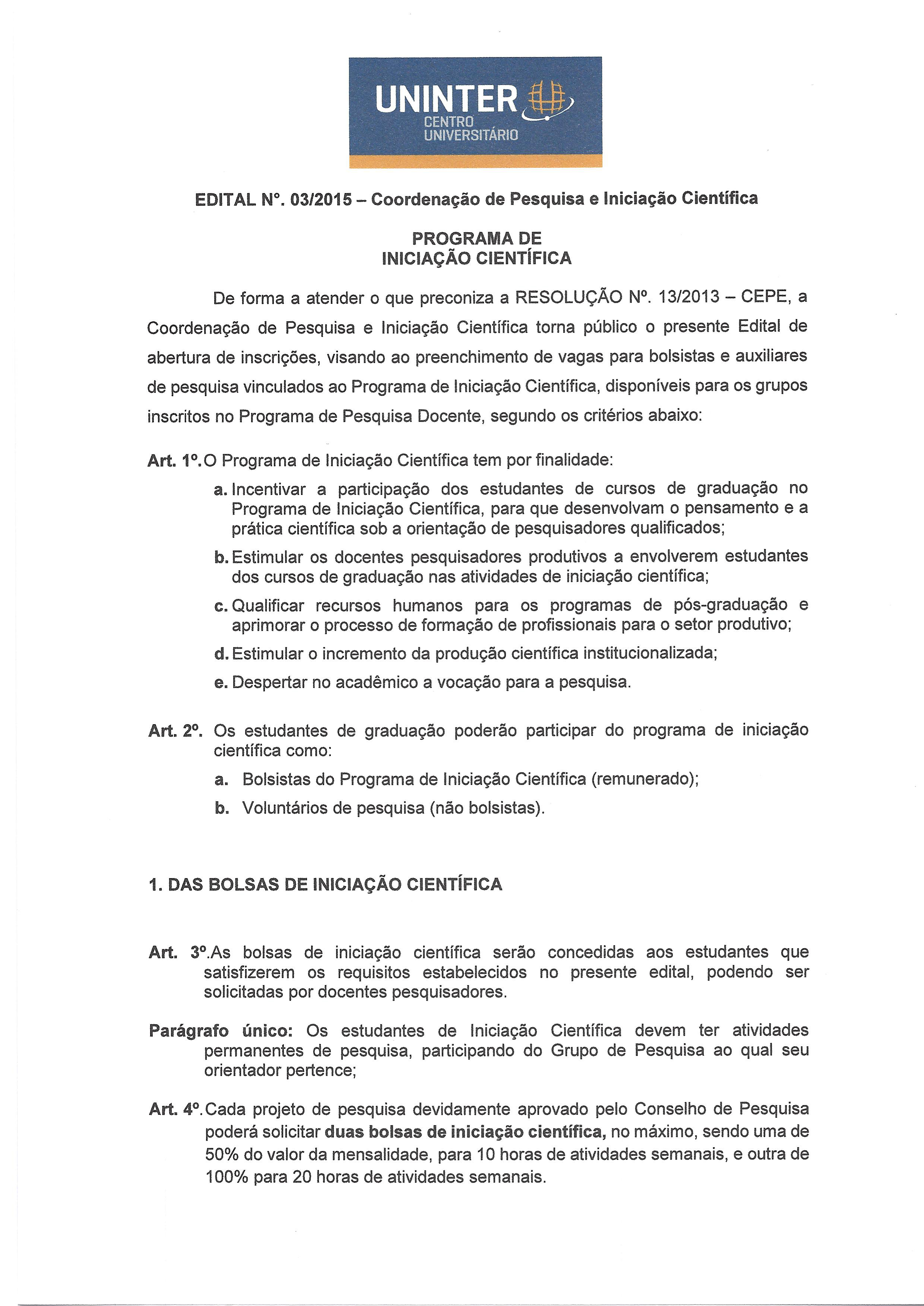 O Programa de Iniciação Científica do Centro Universitário Internacional UNINTER está com inscrições abertas para bolsistas e auxiliares de pesquisa.