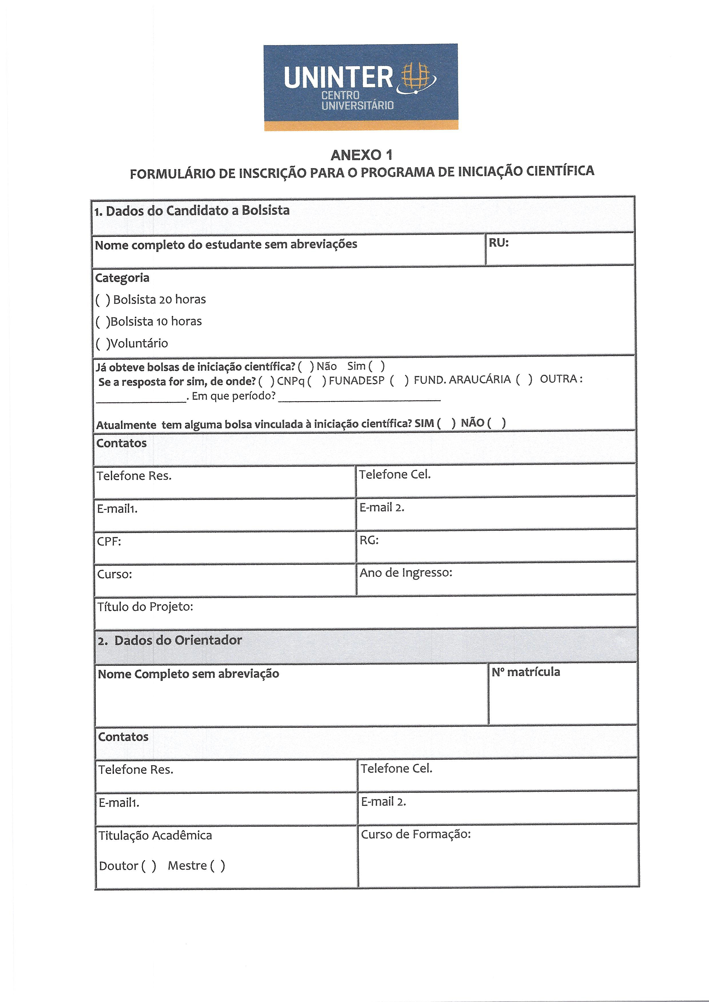 Confira o edital, preencha a ficha de inscrição e entregue no setor de pesquisa na Rua Treze de Maio, 538 ou entre em contato com a Coordenação de Pesquisa com Viviane Trembulack ([email protected] / 3311-5603).