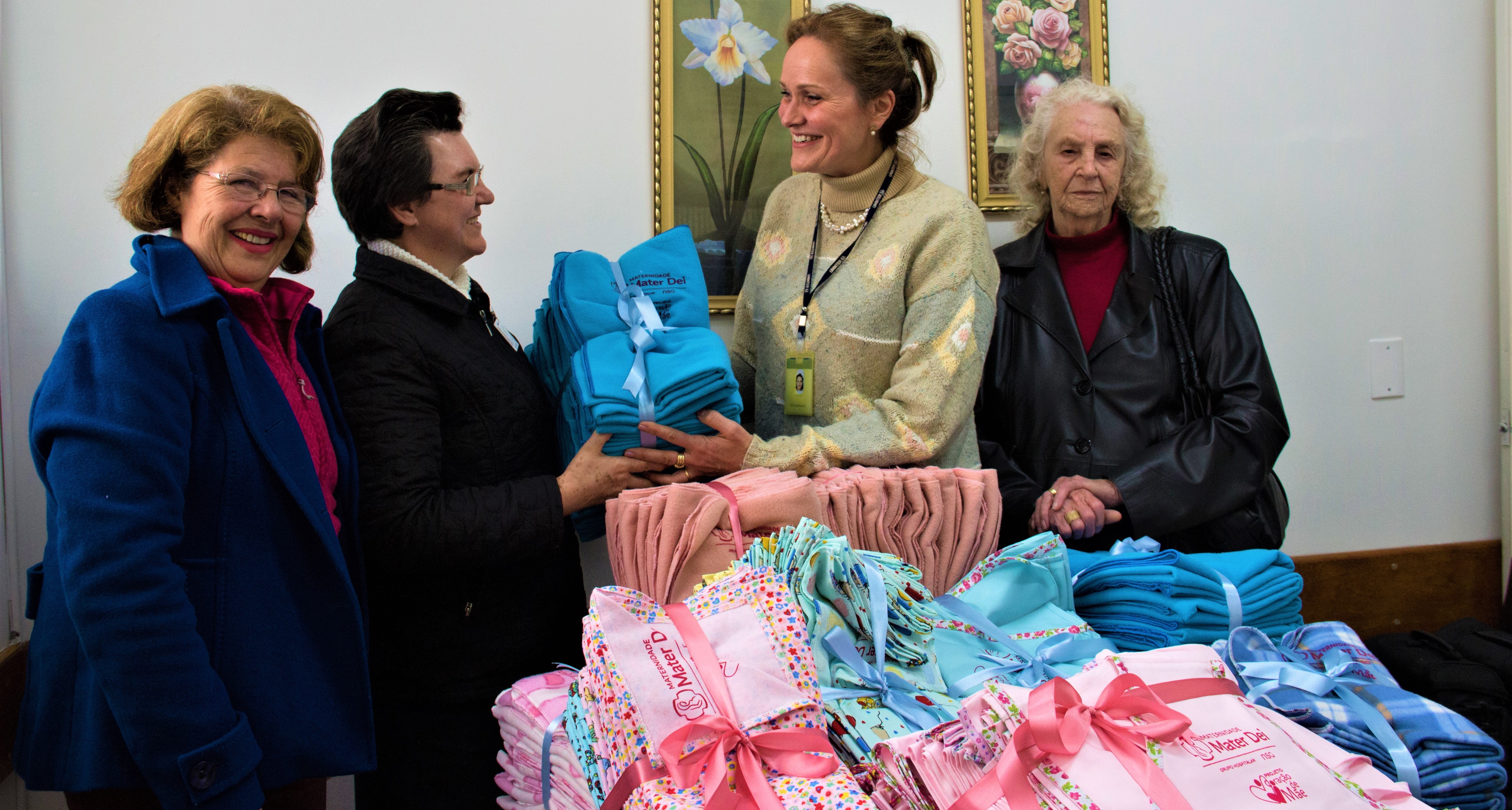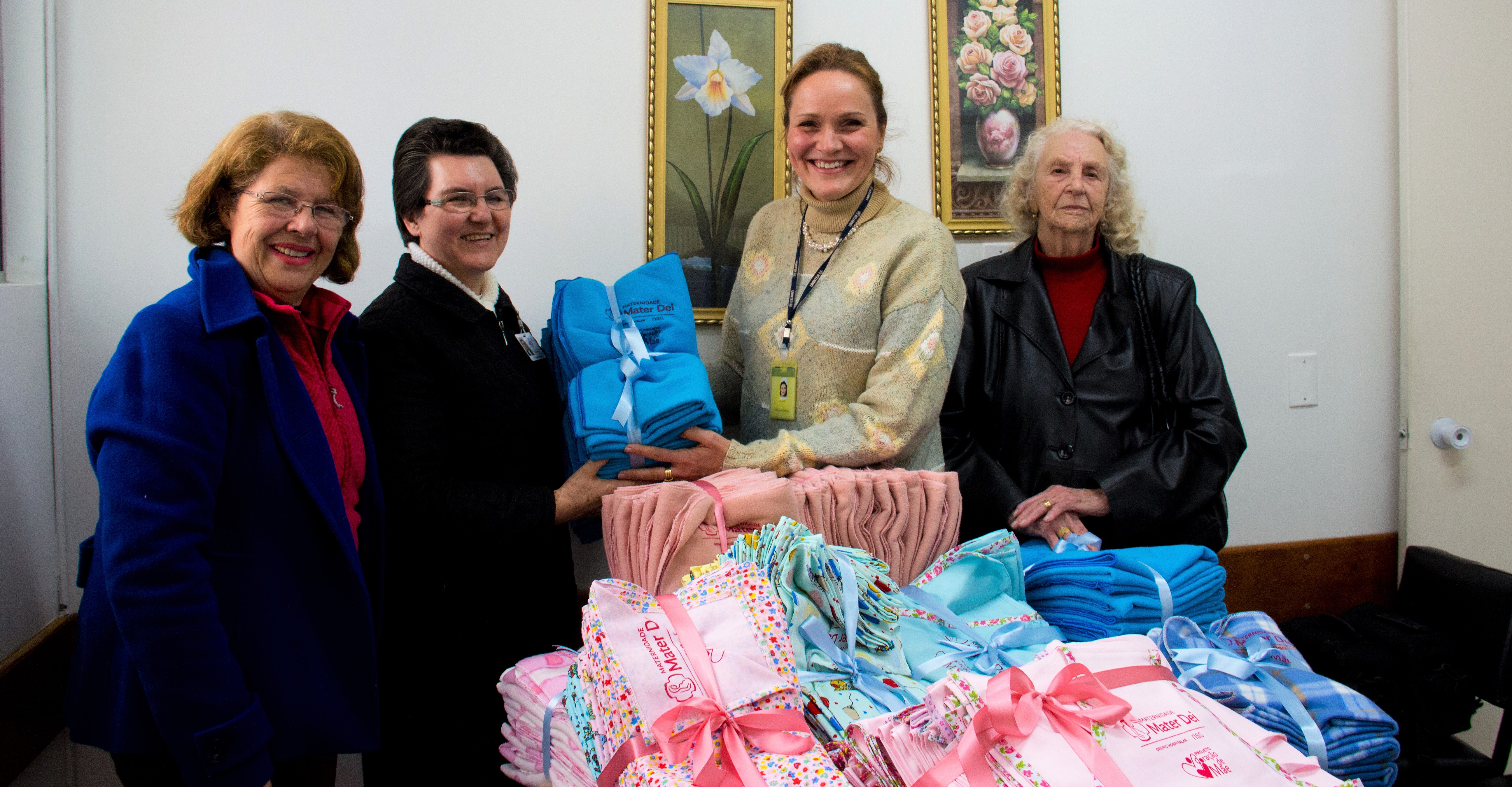 Foram confeccionadas 157 peças, entre camisolas e mantas, especialmente para gestantes e os recém-nascidos. A diretora geral do Hospital Maternidade Mater Dei, Irmã Iracema Vujanski, contou que cada gestante utiliza em média cinco camisolas e os bebês, três mantas. Por causa dessa demanda, são realizadas três idas e vindas na lavanderia para dar conta da quantidade. “É com muita emoção e muita gratidão que recebemos essa doação. Tudo que recebemos será muito útil. Ano passado tivemos mais de 350 crianças nascidas aqui”, diz.