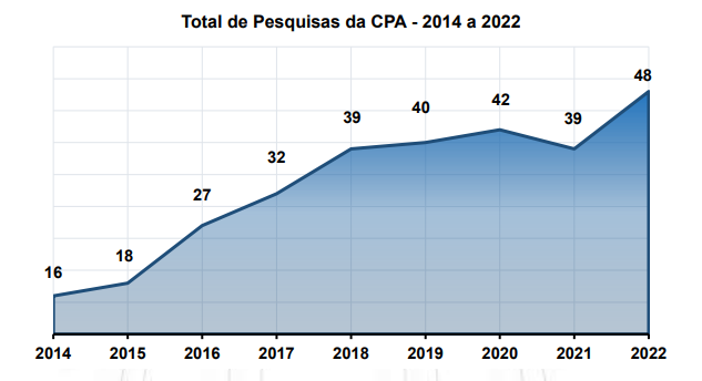 O número de pesquisas realizadas pela CPA aumentou entre os anos de 2021 e 2022, saindo de 39 para 48 pesquisas. As métricas de avaliação da CPA possuem um índice de confiança de 99%, com uma margem de erro inferior a um ponto percentual, para mais ou para menos.