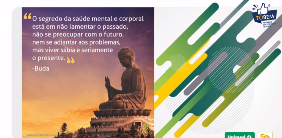 Ao final da palestra, Raphael citou uma frase da filosofia budista que nos revela caminhos para enfrentar nossos problemas emocionais e mentais: “O segredo da saúde, mental e corporal, está em não se lamentar pelo passado, não se preocupar com o futuro, nem se adiantar aos problemas, mas viver sabia e seriamente o presente”.