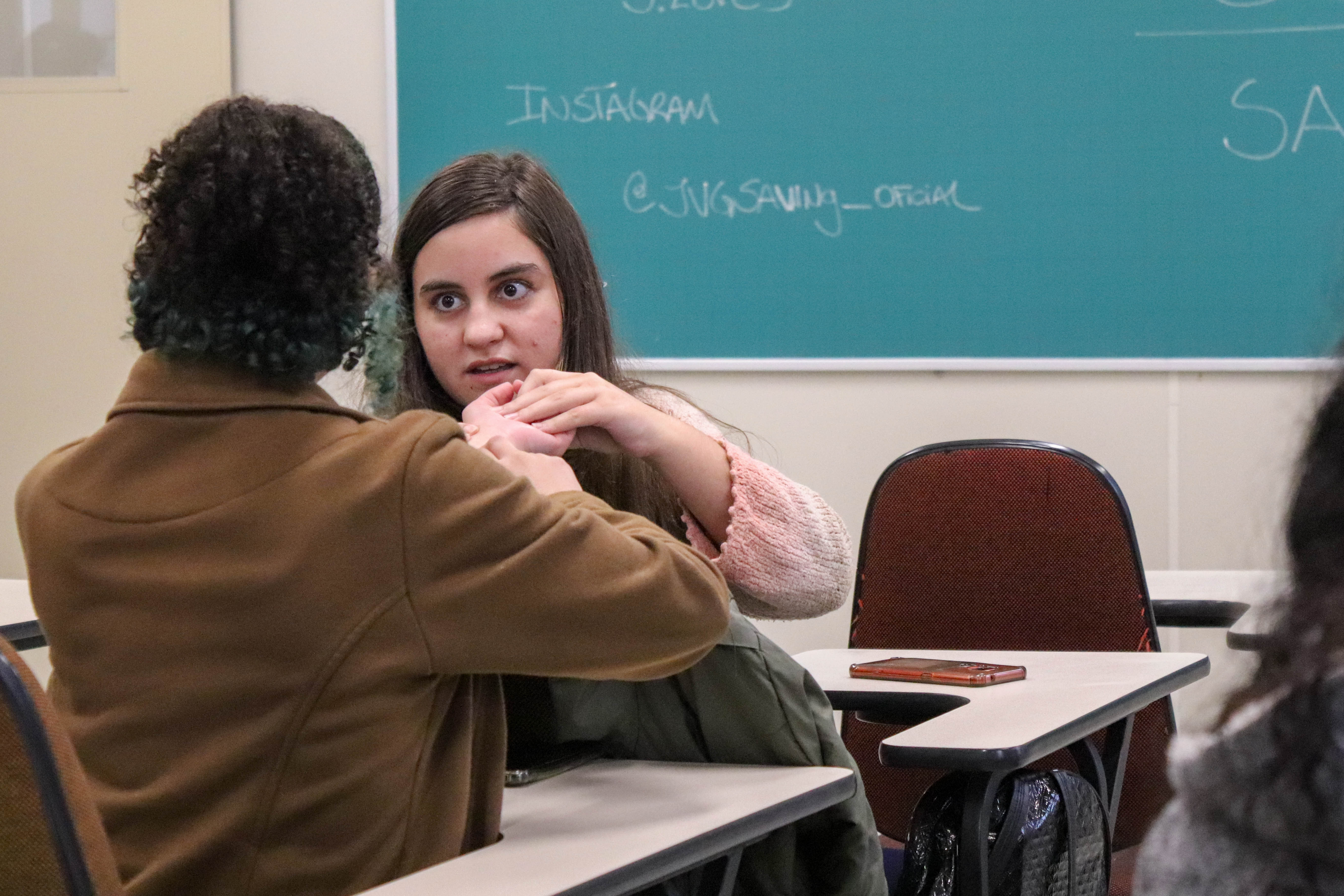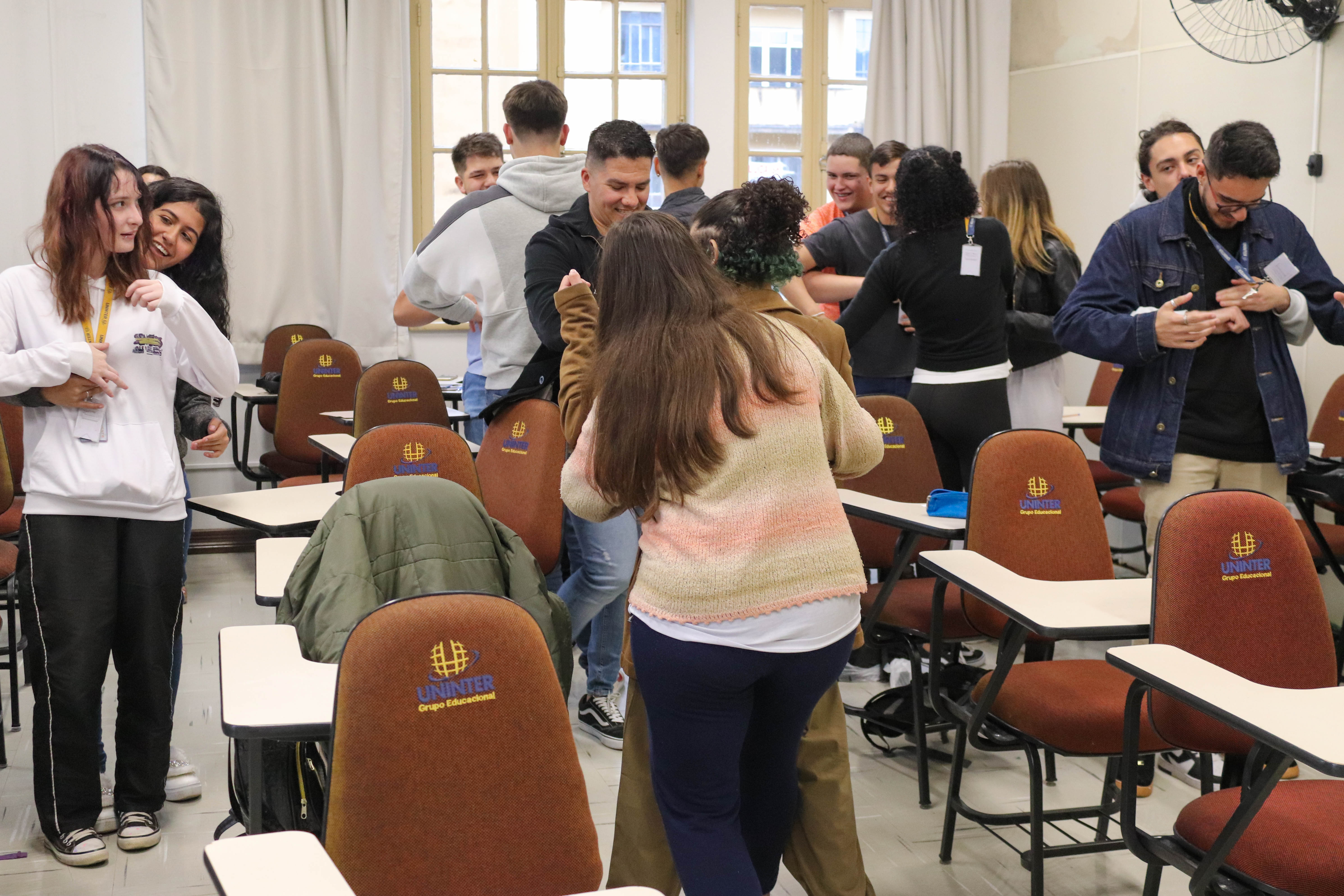 A aprendiz Kauane Guedes de Melo tem 19 anos e atua na Secretaria Acadêmica da Uninter. A jovem representou a manobra de desengasgo para os colegas da turma e aponta que o que mais chama a atenção são as dinâmicas, já que é estudante de Educação Física e acha “interessante aprender e saber um pouco mais da saúde”.