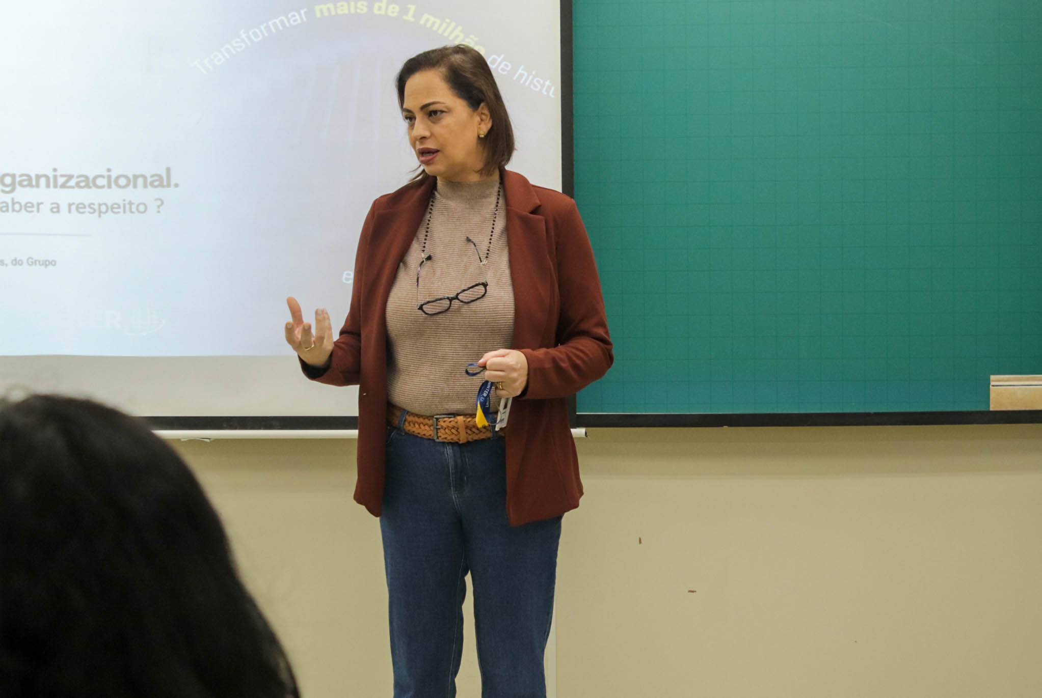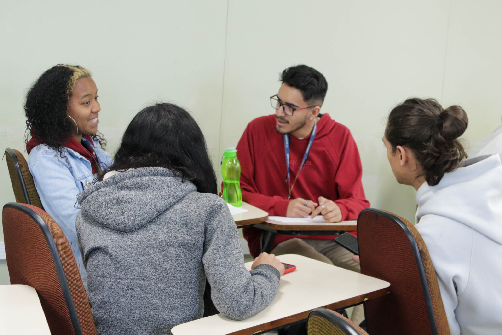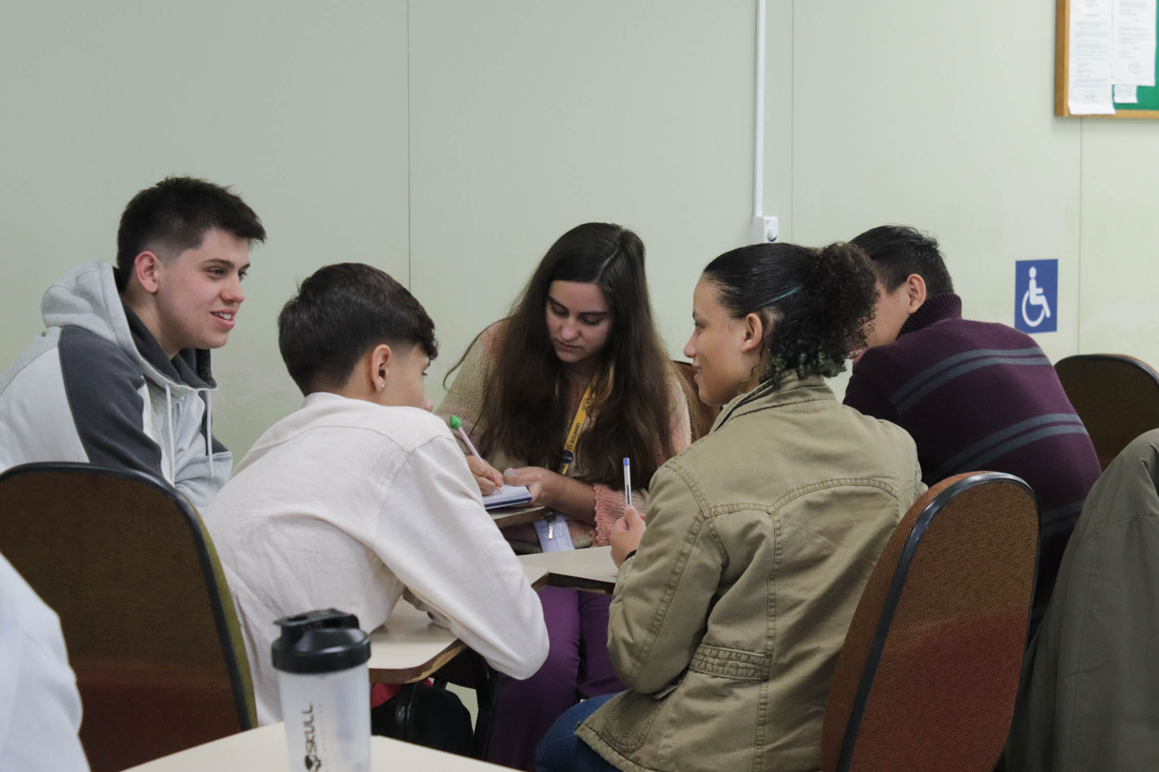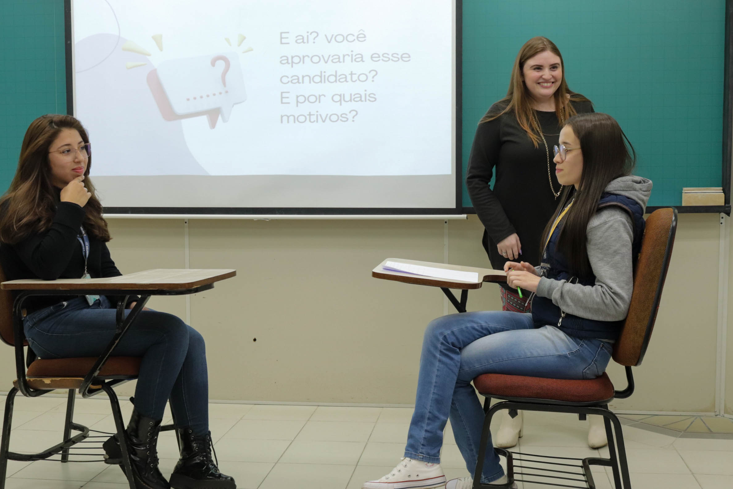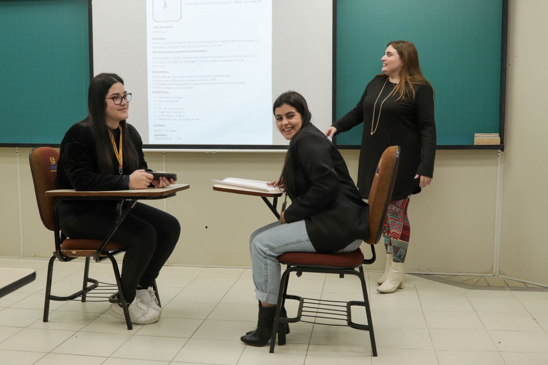 Flávia realizou uma dinâmica em que cada grupo precisava simular uma entrevista de emprego, justificando a admissão ou não do candidato. “Achei muito legal, porque coloca em prática aquilo que aprendemos. Foi um momento para a gente experienciar como seria uma entrevista e de que forma se portar, porque isso influencia”, afirma Heloiza.