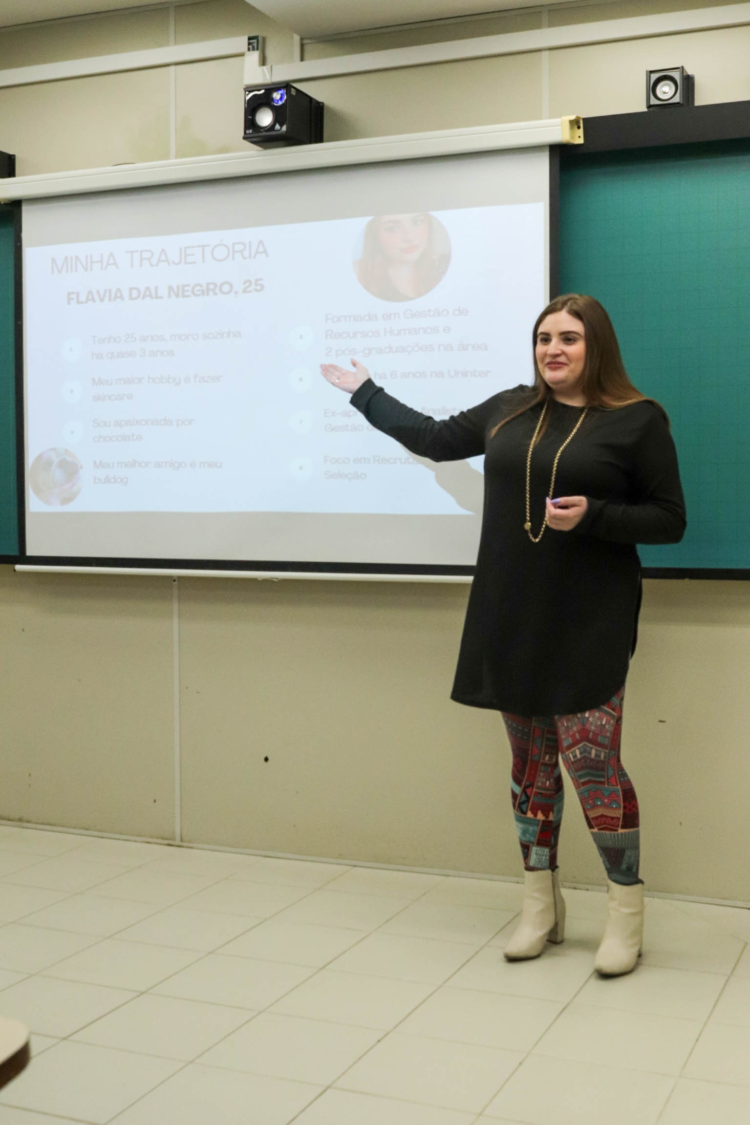Flávia ingressou no Grupo Uninter ainda como jovem aprendiz e hoje faz parte do time de Recrutamento e Seleção. Um caso de sucesso, com efetivação e promoção dentro do setor, a profissional utilizou da rica trajetória que possui para falar com os jovens aprendizes.
