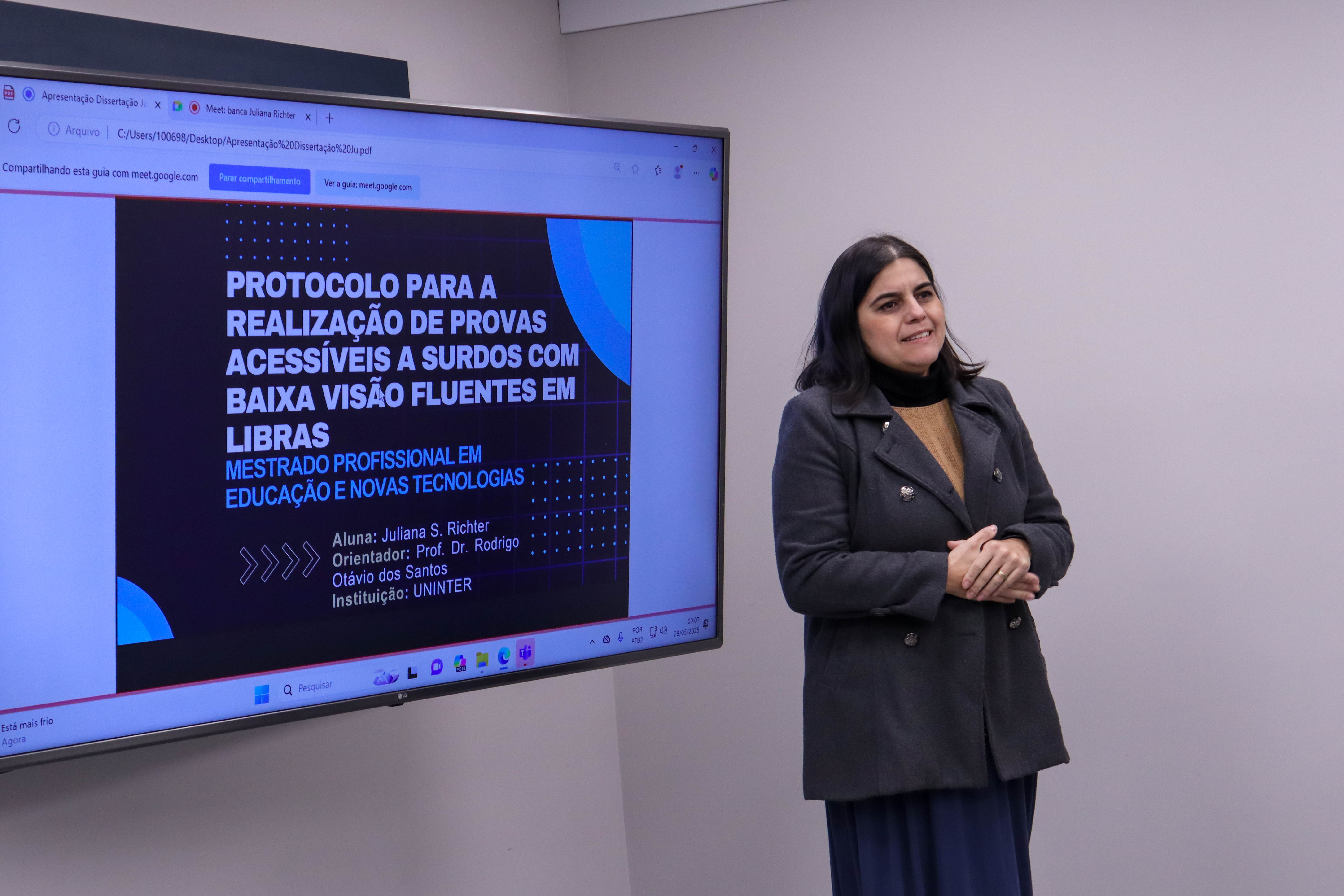 Há 20 anos atuando na educação com a Língua Brasileira de Sinais (LIBRAS), Juliana Richter marca mais uma fase do legado na área, com a dissertação “Protocolo para a realização de provas acessíveis a surdos com baixa visão fluentes em LIBRAS”. Agora mestre, Juliana foi aprovada com o louvor da nota máxima no Programa de Pós-graduação em Educação e Novas Tecnologias (PPGENT) da Uninter, na defesa que aconteceu na manhã de 29 de maio de 2025.