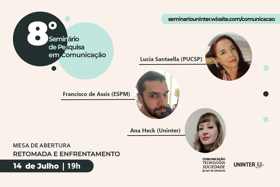 A mesa de abertura, programada para a noite do dia 14, contará com a participação da professora Lucia Santaella (PUCSP) e do professor Francisco de Assis (ESPM-SP). A mediação ficará a cargo da professora Ana Heck (Uninter). Os interessados poderão acompanhar a transmissão pública (8º Seminário de Pesquisa em Comunicação Uninter – YouTube).
