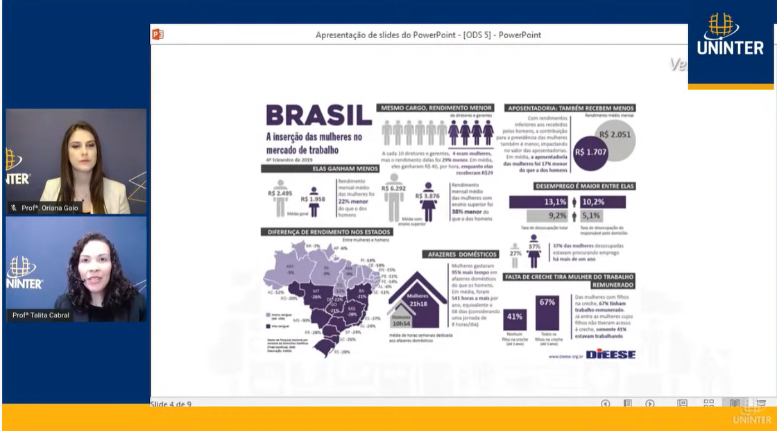 Com mediação da professora Joice Diaz, as professoras e coordenadoras de cursos da pós-graduação Oriana Gaio e Talita Cabral iniciaram suas falas explicando os dois pontos da quinta ODS: reconhecimento e valorização do trabalho doméstico, e participação plena e efetiva das mulheres na política. Essas metas foram escolhidas devido à atualidade dos assuntos. O trabalho doméstico veio à tona por causa da quarentena, que mostrou como ele ainda não é valorizado. O segundo ponto foi escolhido pelo fato de estarmos em um ano eleitoral.