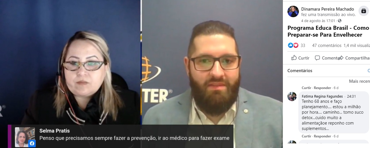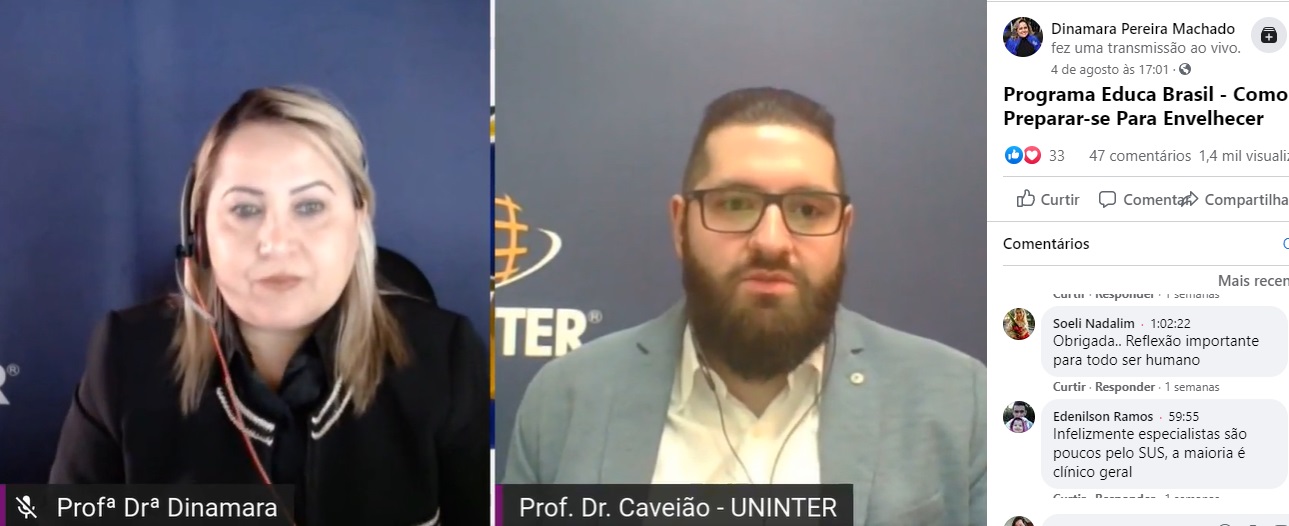O especialista foi o convidado da edição do programa Educa Brasil sobre Como preparar-se para envelhecer, apresentado pela diretora da Escola Superior de Educação (ESE) da Uninter, Dinamara Machado. A transmissão é realizada através do Facebook e do canal do Youtube da ESE, além do canal de televisão IESTV (canal 15 da NET para Curitiba e região), toda terça-feira às 17 horas. Siga a página do Facebook para acompanhar as próximas edições ao vivo.