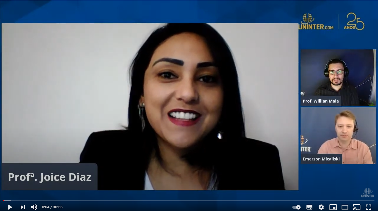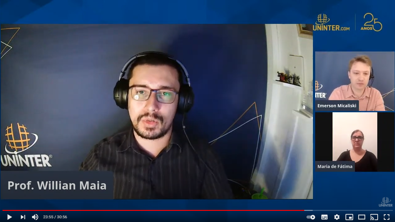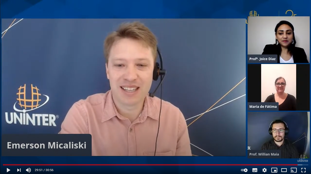 O tema “O esporte em tempos de pandemia” foi debatido durante a II Maratona Pós-Graduação Uninter no último dia 29.mai.2021 com mediação da professora Joice Diaz, participação dos professores Emerson Micaliski e Willian Maia que fazem parte do cursos área de pós-graduação da área desportiva. Para o bate-papo foi convidada Maria de Fátima Fernandes, profissional de educação física e da fisioterapia esportiva, com experiência em Jogos Olímpicos e Paralímpicos – participou das Olímpiadas do Rio 2016, no comitê organizador de canoagem.