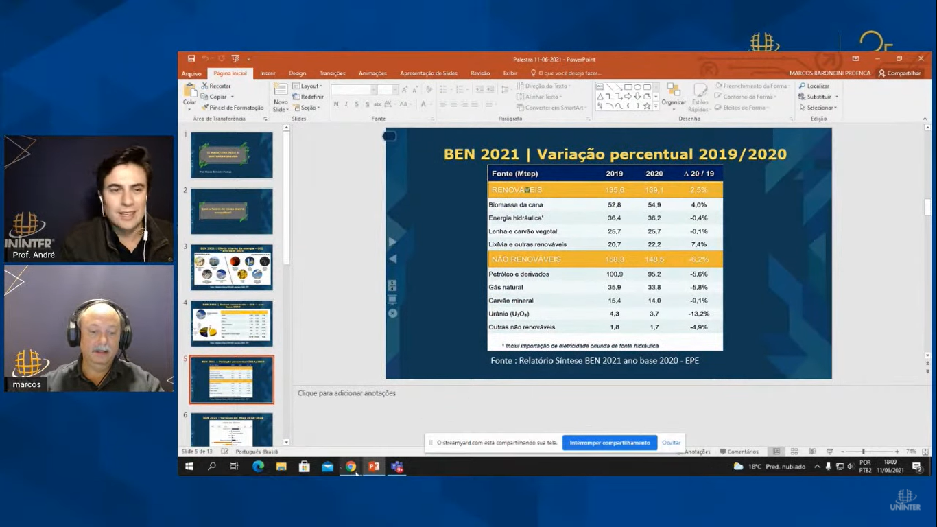 Marcos Proença debateu o tema Qual o futuro da nossa matriz energética? ao longo da 2ª Maratona da sustentabilidade da Uninter. O evento, mediado por André Pelanda, que atua na Escola Superior de Saúde, Biociência, Meio Ambiente e Humanidades, está disponível no Facebook e no canal do YouTube da Uninter.
