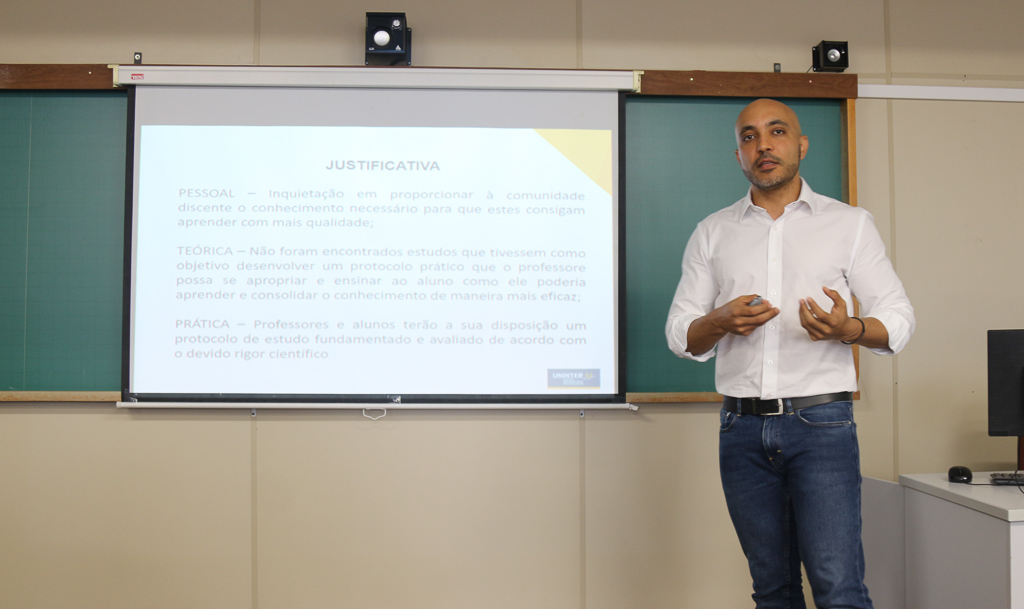 A psicologia é uma área que estuda os processos mentais dos indivíduos, baseando-se em suas sensações e percepções do mundo. Na educação, a psicologia ajuda os estudantes a ter um melhor desempenho nas aulas. Sob orientação da professora Marilene Santana, Leonardo Honório dos Santos, estudante do Mestrado em Educação e Novas Tecnologias da Uninter, apresentou um protocolo de estudo baseado na psicologia cognitiva para auxiliar estudantes de cursos superiores. Sua dissertação foi defendida no dia 21.fev.2020, no campus Tiradentes.