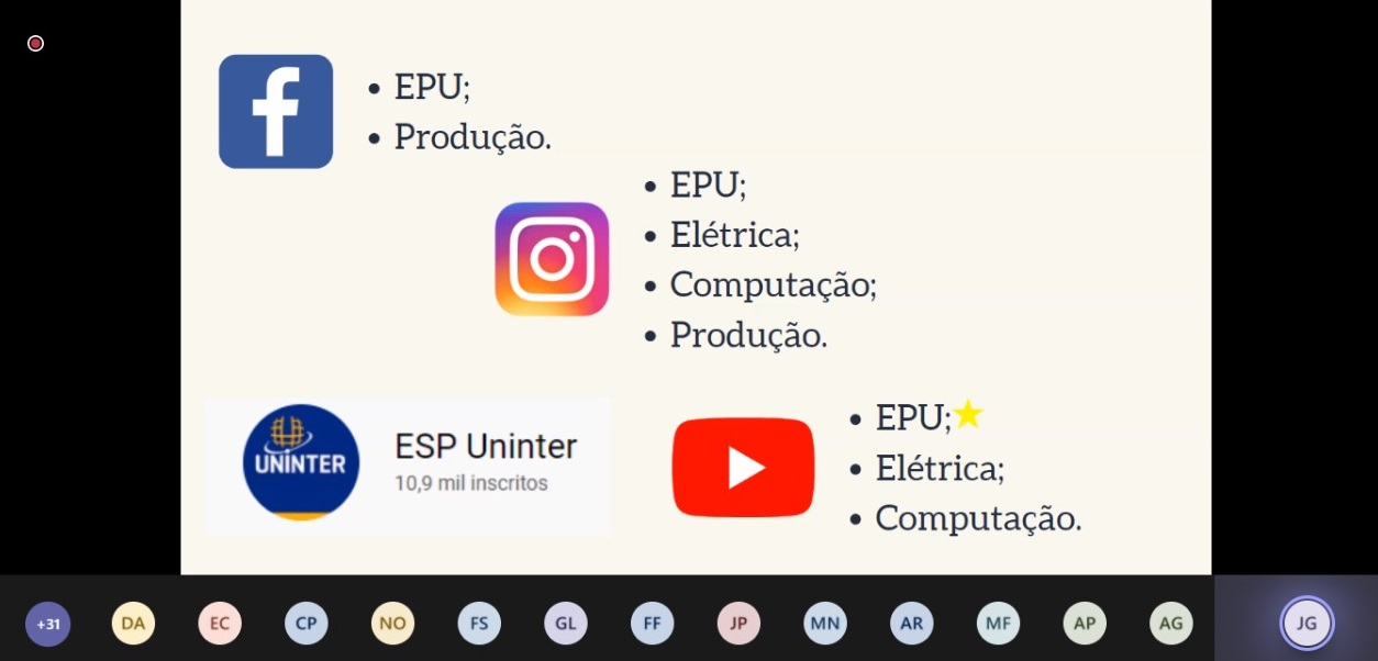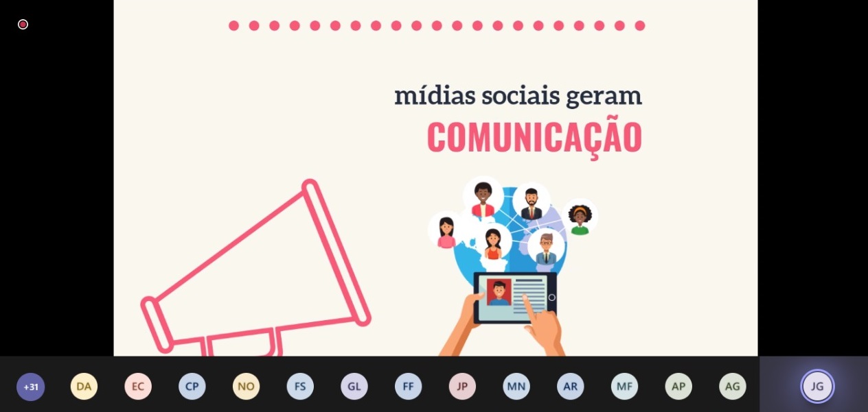 A docente Jéssika Alvares Coppi Arruda Gayer finalizou o dia com uma palestra abordando as mídias sociais na Escola Superior Politécnica da Uninter. O objetivo é a produção de textos e conteúdos de qualidade, para gerar maior engajamento dos alunos. Jéssika passou várias dicas e abordou temas como: frequência de postagens, interação nos comentários das publicações e stories, cultura do cancelamento, entre outros.