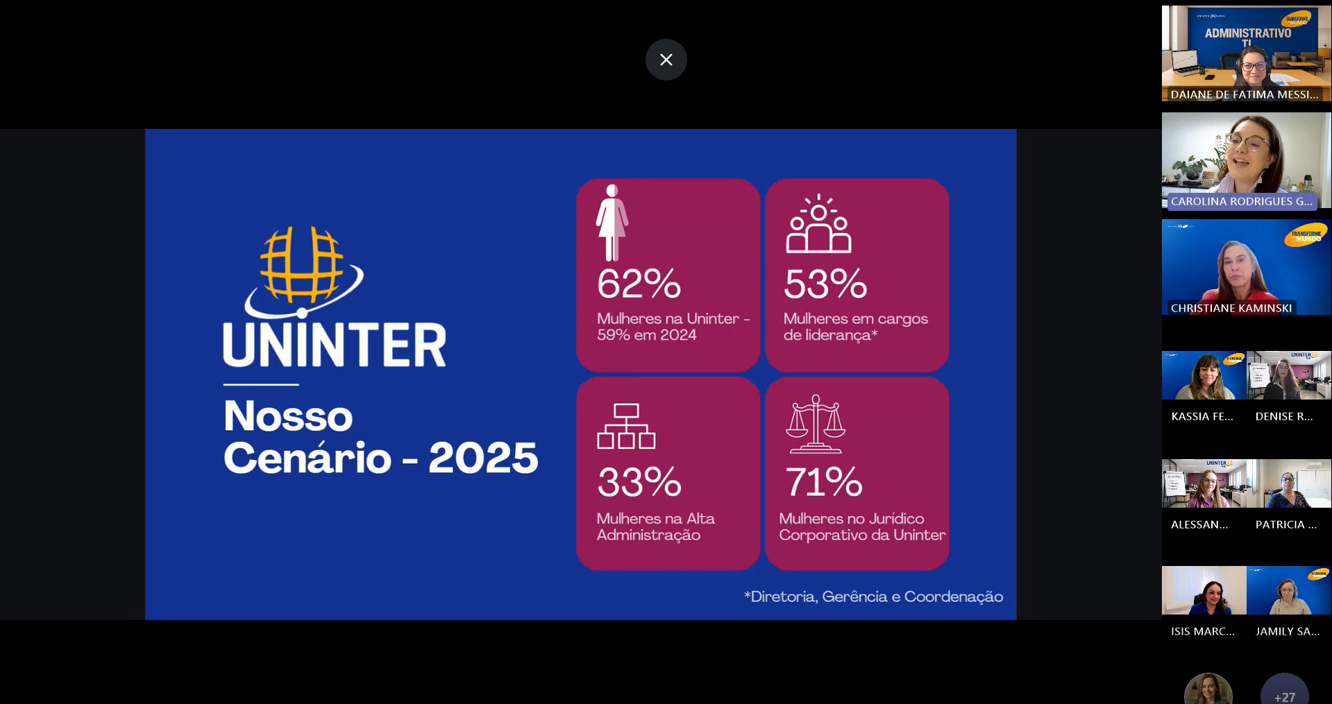 Iniciando a palestra, Carolina trouxe dados recentes sobre a mulher no mundo corporativo. O cenário no geral mostra que ainda há muito a ser feito, mas dentro da Uninter os dados apontam as mulheres na maioria. Na instituição, 62% dos cargos ocupados por mulheres e dentro desses números, 71% trabalhando no jurídico, 53% em cargos de liderança e 33% de mulheres em alta administração.