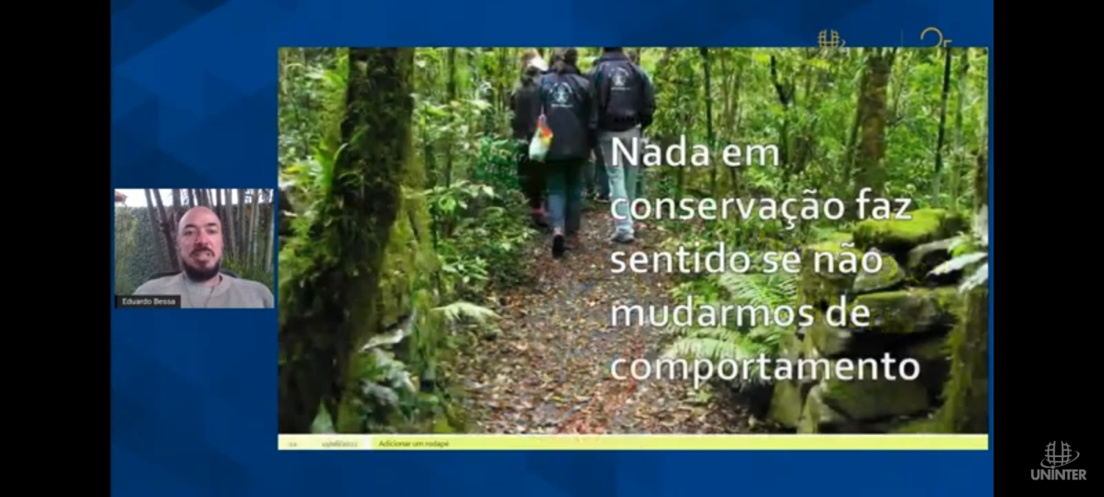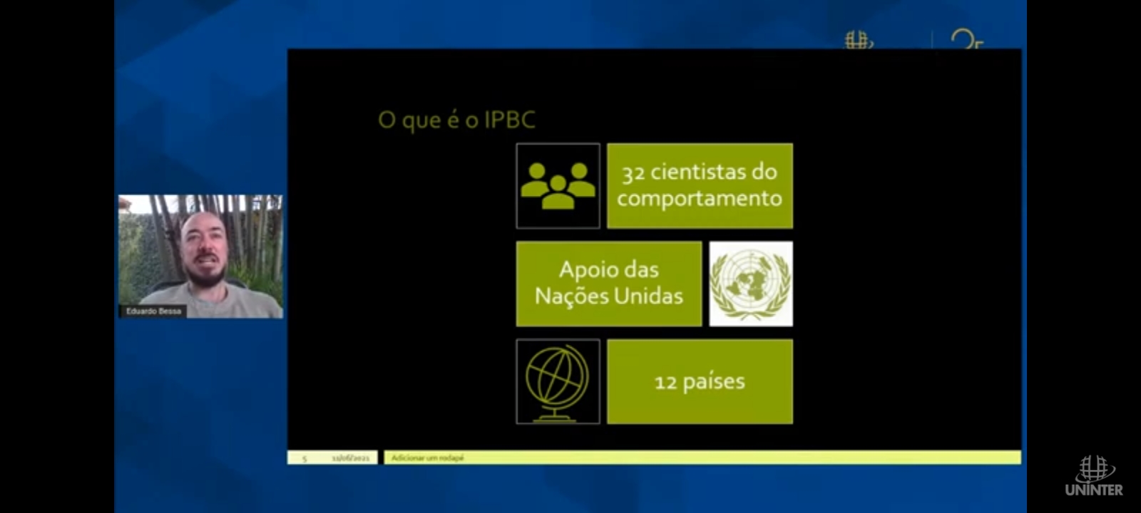 O professor Eduardo Bessa falou sobre o assunto em sua participação como convidado na 2° Maratona da Sustentabilidade, promovida pela Escola de Saúde, Meio Ambiente e Humanidades da Uninter, com o tema “Como estimular atitudes mais sustentáveis em uma escala global? A missão do painel internacional de mudanças comportamentais (PNUMA/ONU)”. Durante a live, exibida no dia 11.jun.2021 através das plataformas digitais da Uninter, o membro da diretoria do IPBC e professor de Comportamento Animal da Universidade de Brasília (UnB) enfatizou: “não existe sustentabilidade sem mudança de comportamento”.