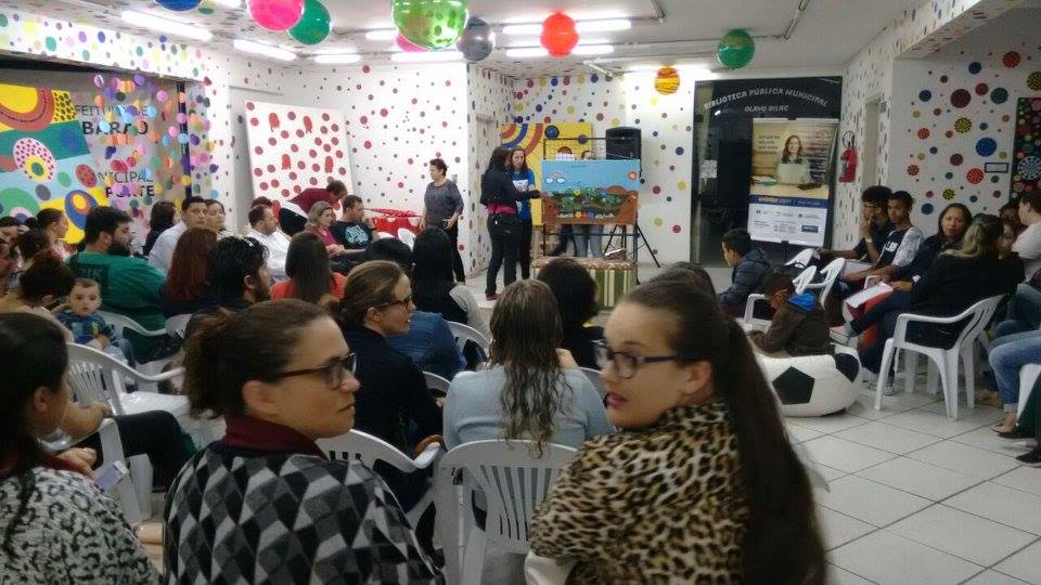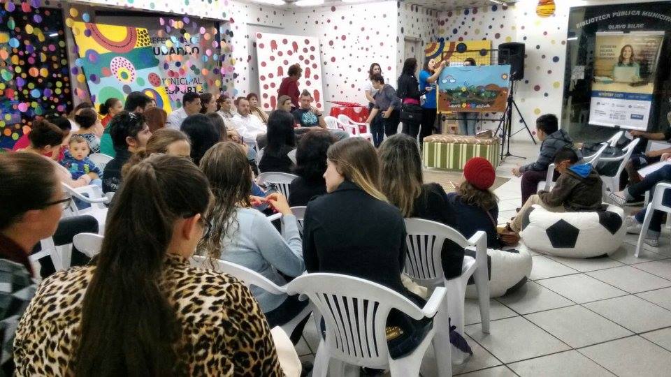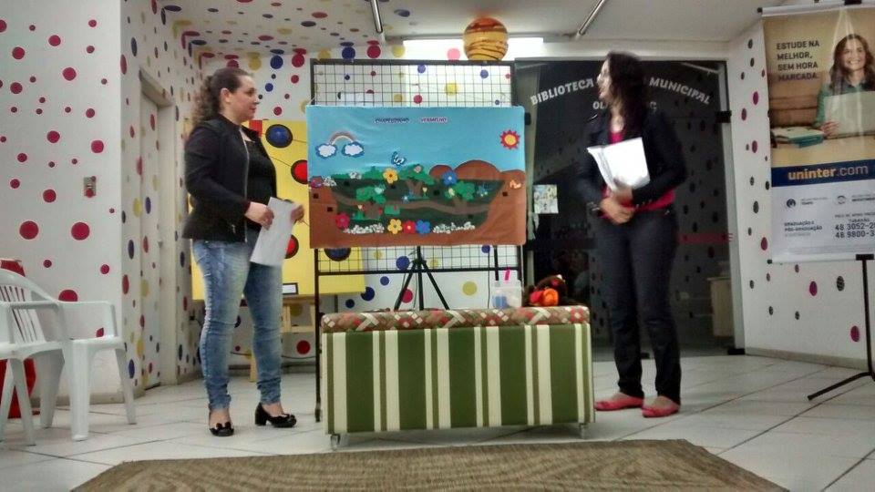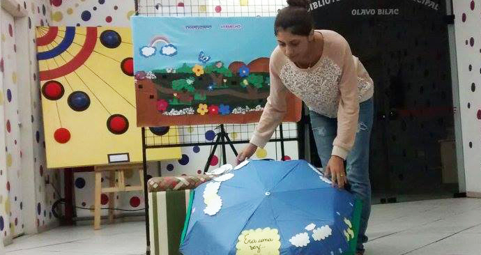 Na oficina de preparação do material da exposição, os visitantes também puderam ver as técnicas criativas de contar histórias, como a contação no guarda-chuva, na qual as alunas de Pedagogia utilizaram cada divisão no tecido para contar uma história.