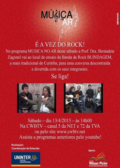 Você sabia que no Centro Universitário UNINTER quem entende, gosta e vive da música pode participar do programa Musica no Ar? Coordenado pela professora Bernadete Zagonel, o programa é apresentado todos os sábados, sempre com destaque para um tema diferente. Os assuntos são bem variados, tem entrevistas de bandas, professores de música, DJs e pessoas como o arquiteto Oswaldo Hoffmann, que sabe tudo sobre o Jazz. O programa teve início em agosto de 2012 e já tem mais de 14 edições exibidas pelos canais CWB TV, Canal 5 NET ou 72 TVA, ou pela internet no site www.cwbtv.net. Neste sábado, a entrevista traz a banda Blindagem.
