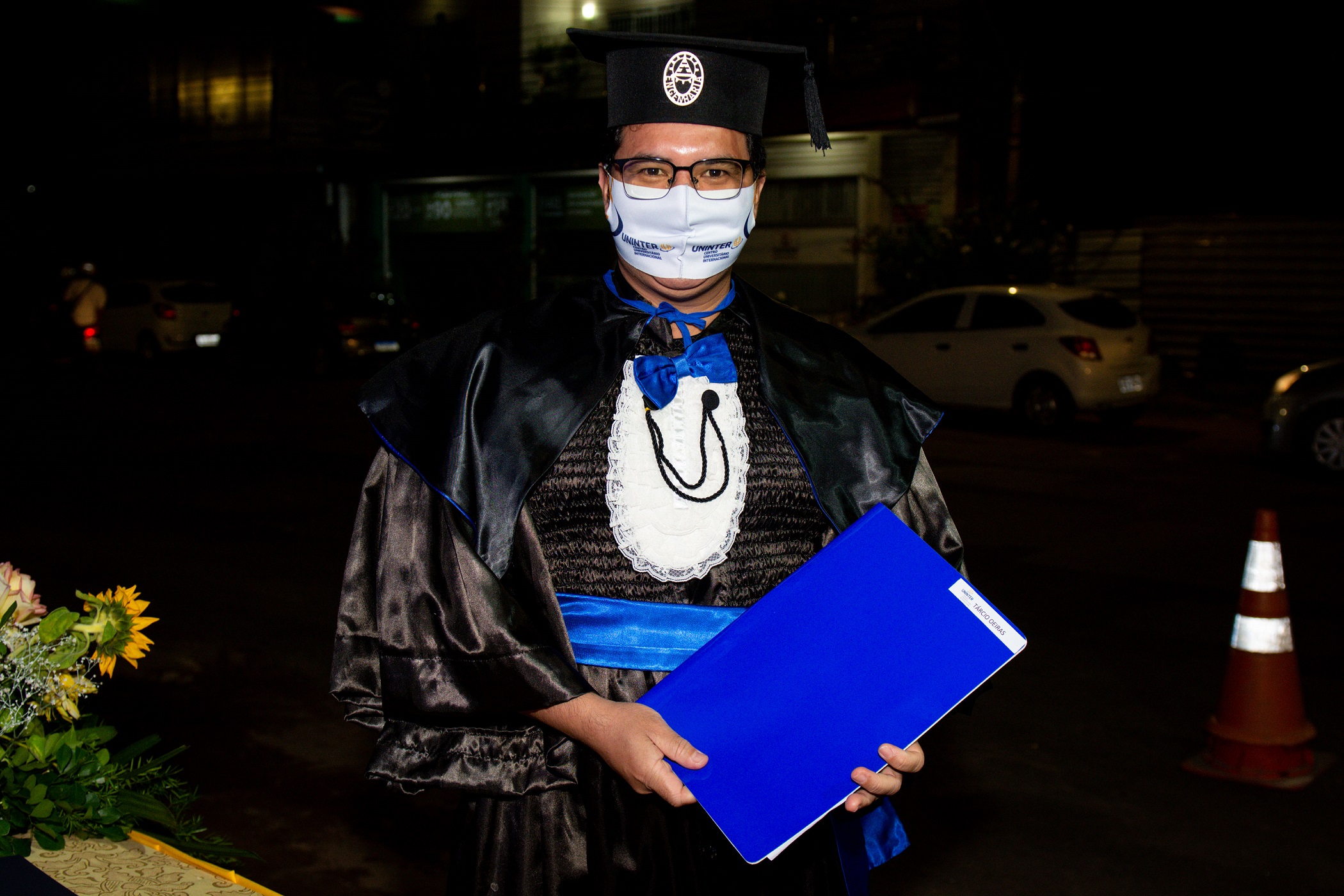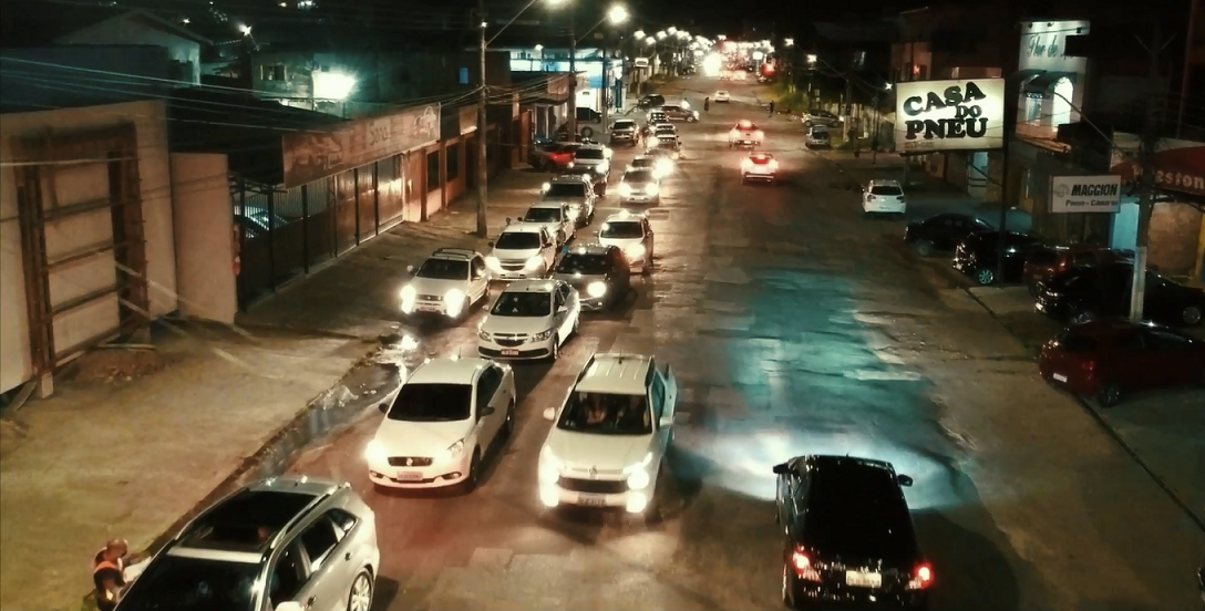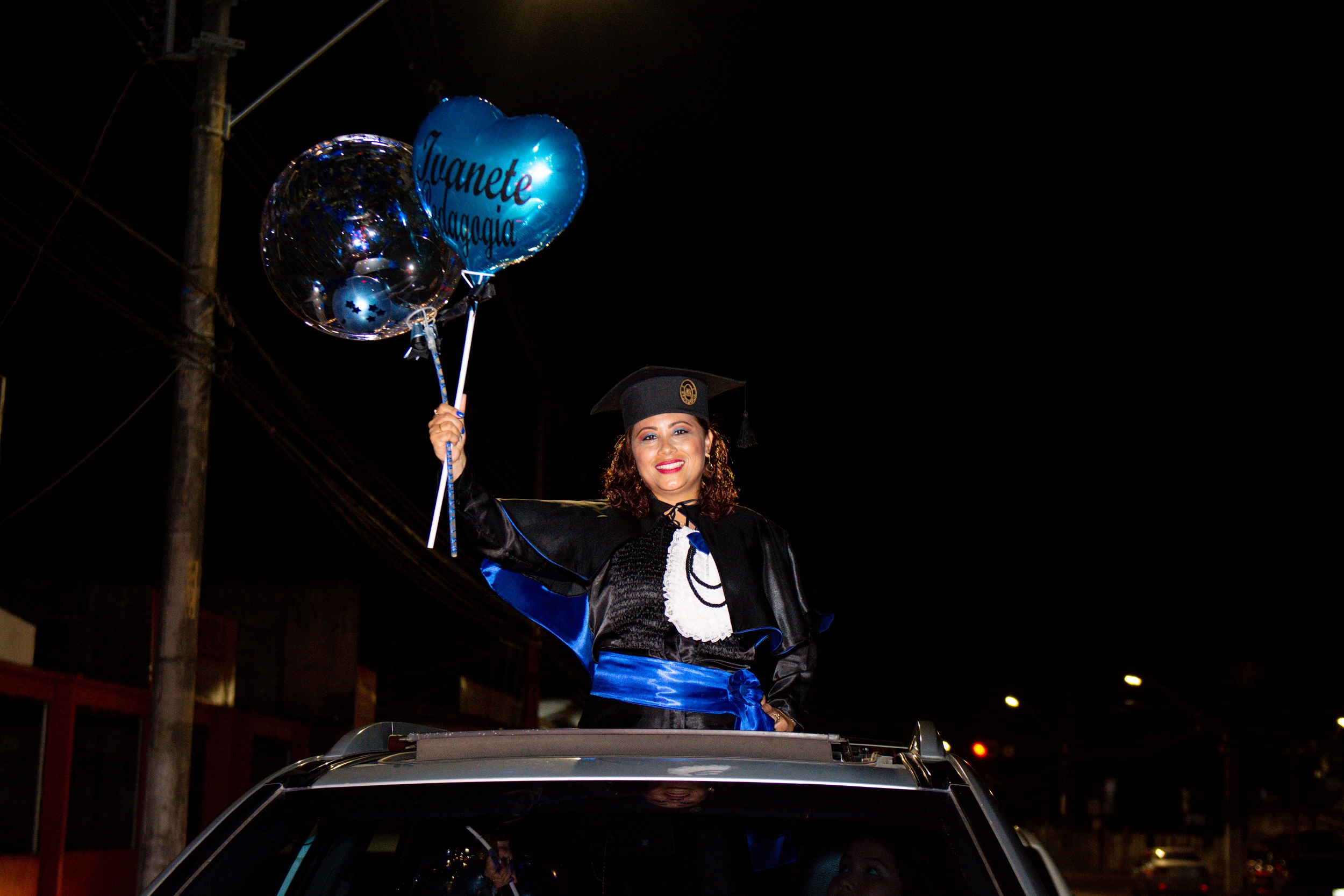 Uma extensa fila de carros atravessava a avenida em direção à estrutura erguida em frente ao polo de apoio. A organização se deu pela ordem dos formandos a receberem a outorga de grau. De dentro dos veículos, amigos e familiares acompanhavam a cerimônia. A movimentação, as buzinas, os fogos, os balões, o palco e os alto-falantes despertavam a curiosidade de quem passava na rua.