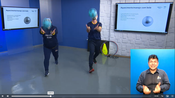A primeira aula prática deste mês foi sobre alongamento, aquecimento e ginástica, realizada no dia 13 de agosto. Ministrada pela professora Evelyne Correia e pelo professor Carlos Alberto, da Área de Linguagens Cultural e Corporal, a aula foi transmitida ao vivo e também teve a participação da professora Marina Aggio, de Curitiba, da aluna Silésia Silva, do polo de Itaúna (MG), e da orientadora Paula D’Avila, do polo de Bauru (SP).