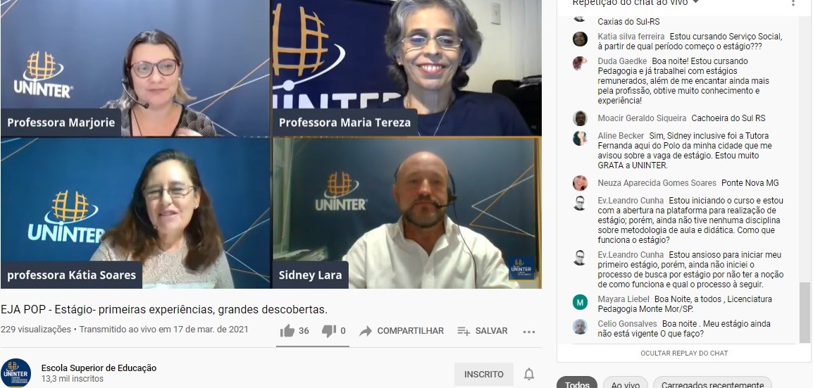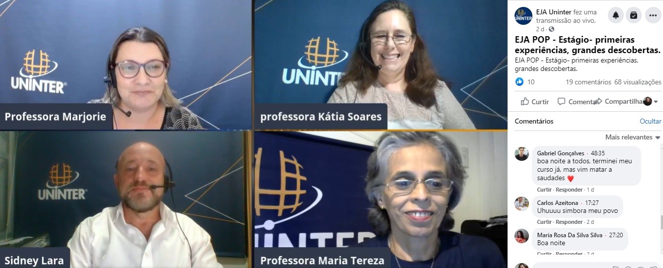 Kátia e Sidney debateram sobre o tema Estágio: as primeiras experiências, grandes descobertas na última edição do programa EJA Pop, transmitido ao vivo no dia 17.mar.2021. O bate-papo foi mediado pela coordenadora da EJA Uninter, Maria Thereza Xavier, e pela professora Marjorie Wilt, tutora da área. As lives seguem disponíveis para acesso, na página do Facebook e canal do Youtube.