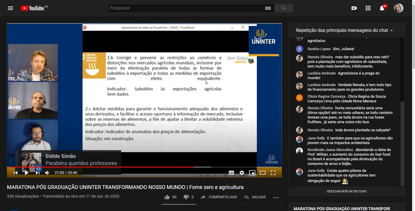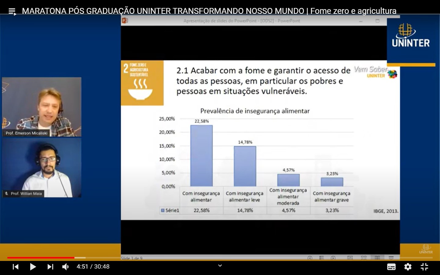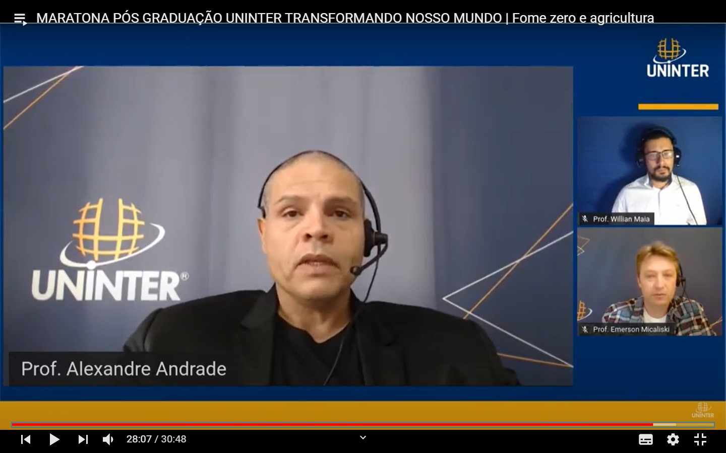 No sábado, 17.out.2020, foi promovida no canal da Uninter no YouTube a Maratona Transformando o Mundo: os Objetivos de Desenvolvimento Sustentável. Foram abordadas 17 áreas determinadas pela Assembleia Geral das Nações Unidas que necessitam de medidas urgentes para que possamos ter um planeta mais igualitário e sustentável. Na live, os professores de cursos de pós-graduação da Uninter Emerson Micaliski, Willian Maia e Alexandre Andrade apresentaram quais são as questões que precisam de ações para o ODS 2 ser alcançado.