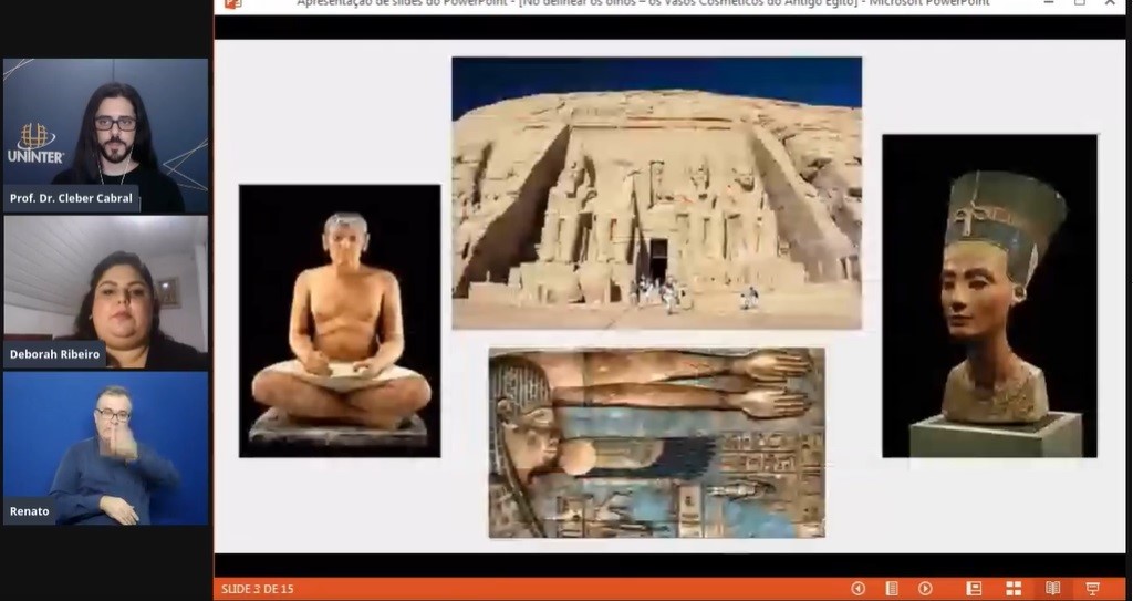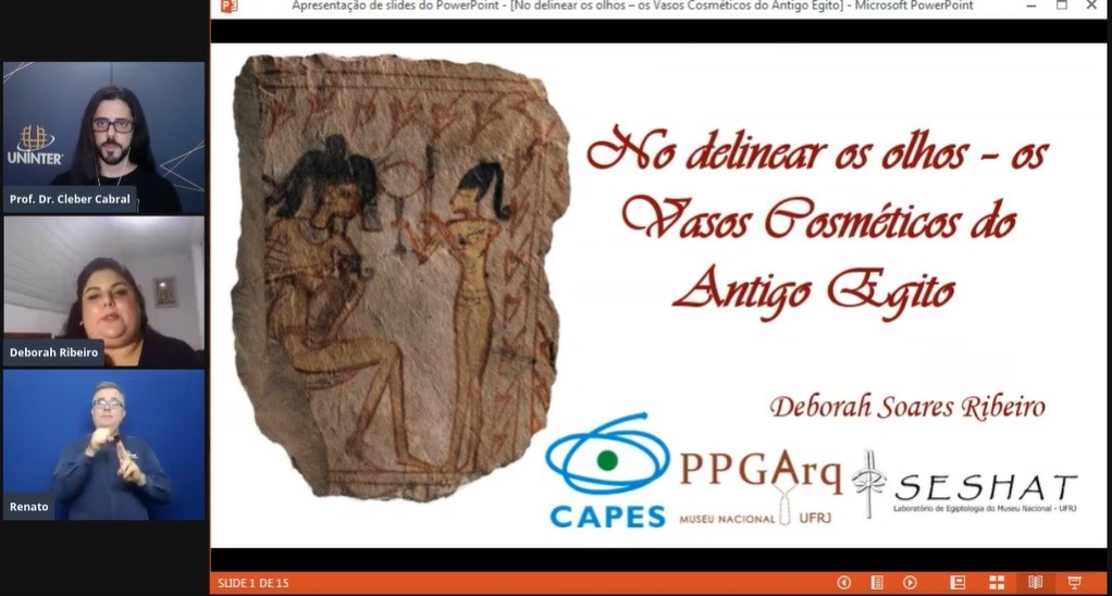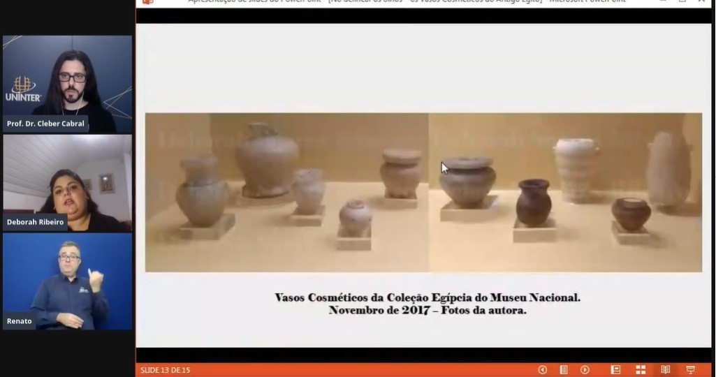 Deborah fala sobre o tema No delinear os olhos: os vasos cosméticos do Egito Antigo na última noite do 2º Seminário virtual de estudos sobre o Antigo Egito, realizado pela área de Linguagens e Sociedade da Escola Superior de Educação (ESE) da Uninter. Ela lembra que, junto com essa cultura, existem os objetos que amparam a prática da pintura. Os chamados vasos cosméticos, que também podem ser citados como tubos ou potes cosméticos, além de itens de beleza ou de banho.