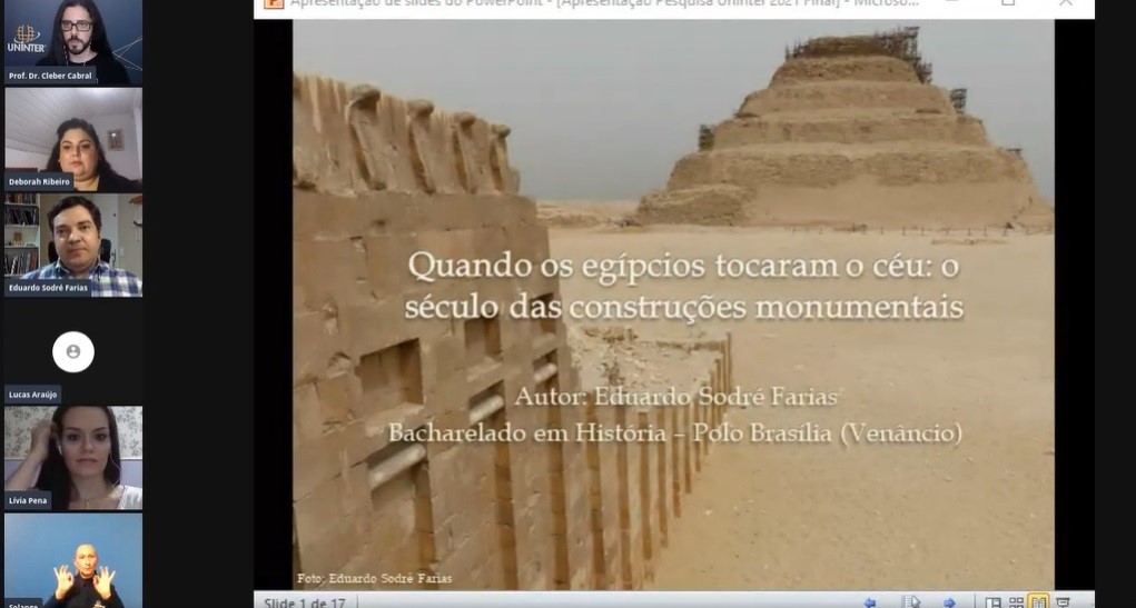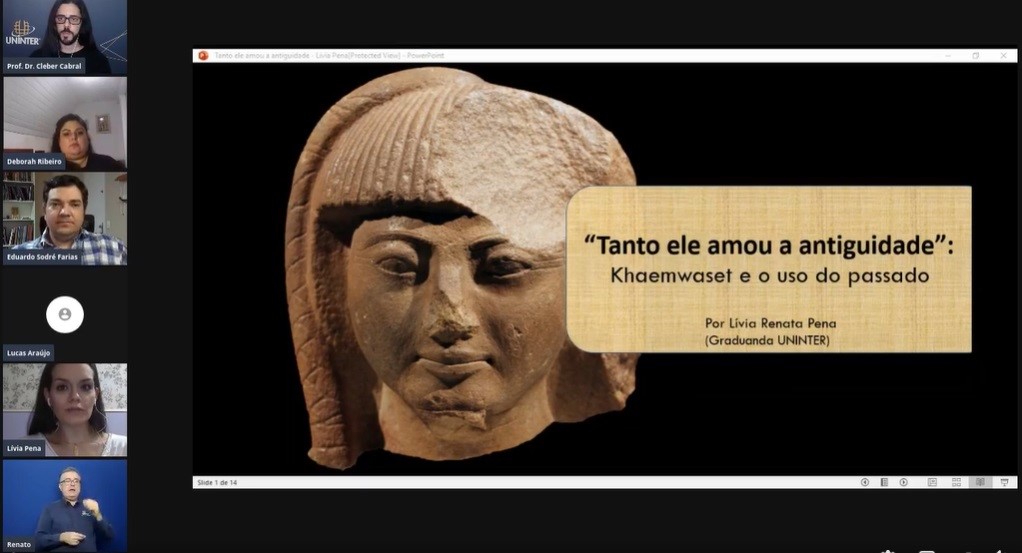 Além de Deborah, um egresso e dois estudantes da Uninter participaram do evento, para apresentação de pesquisas realizadas na área. O estudante de bacharelado em História, Eduardo Farias, abordou o estudo “Quando os egípcios tocaram o céu: o século das construções monumentais”. Na licenciatura do mesmo curso, Lívia Pena apresentou a pesquisa “Tanto ele amou a antiguidade: Khaemwaset e o uso do passado”. Já o licenciado Lucas Araújo, falou sobre “O único e resplandecente senhor da eternidade: as várias faces de Aton”.