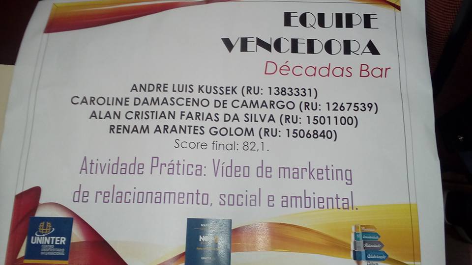 No final das votações, com 232 curtidas na página, a equipe campeã foi a Décadas Bar. Participaram da atividade oito grupos, e os vídeos foram produzidos em seis semanas.