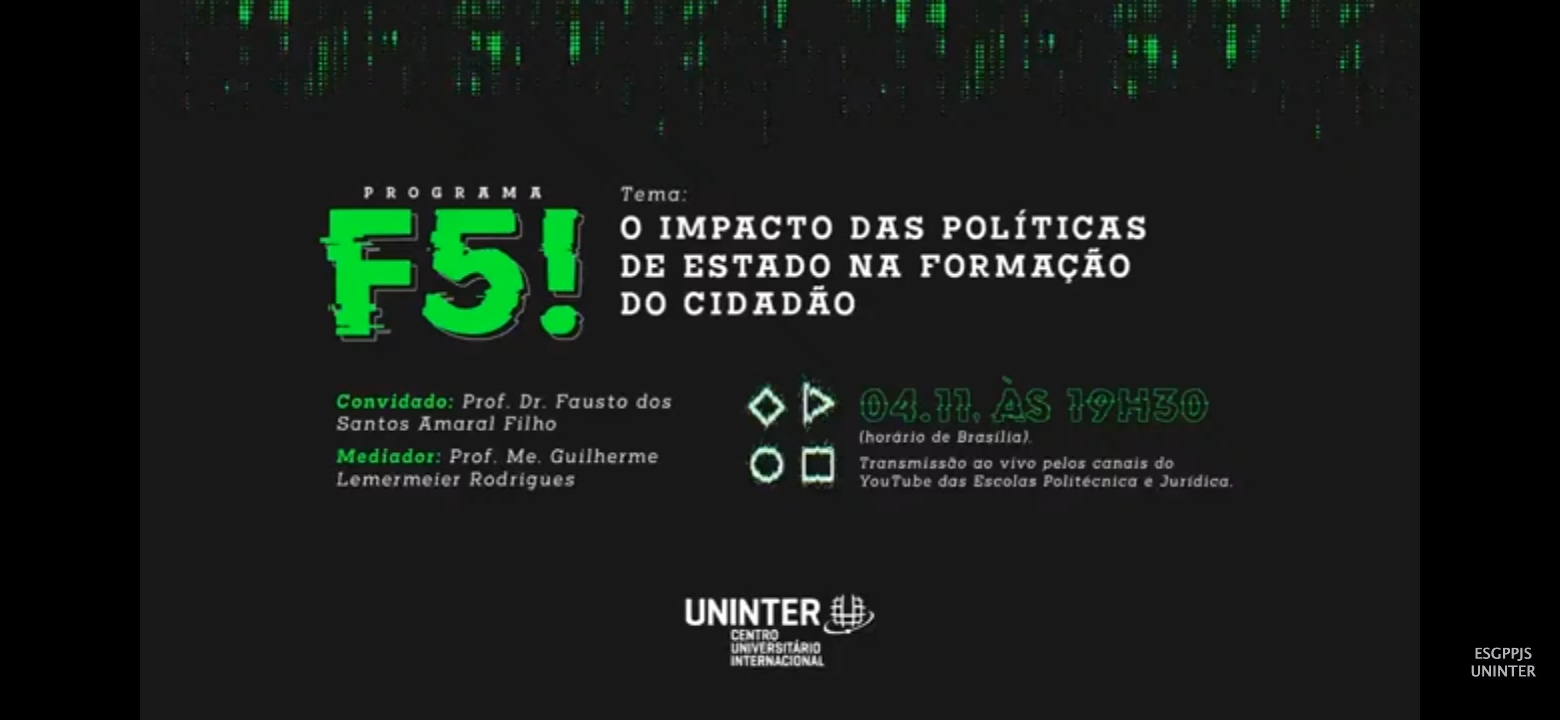 Assista ao “Programa F5!” pelo canal de Youtube da Escola de Gestão Pública, Política, Jurídica e Segurança da Uninter.
