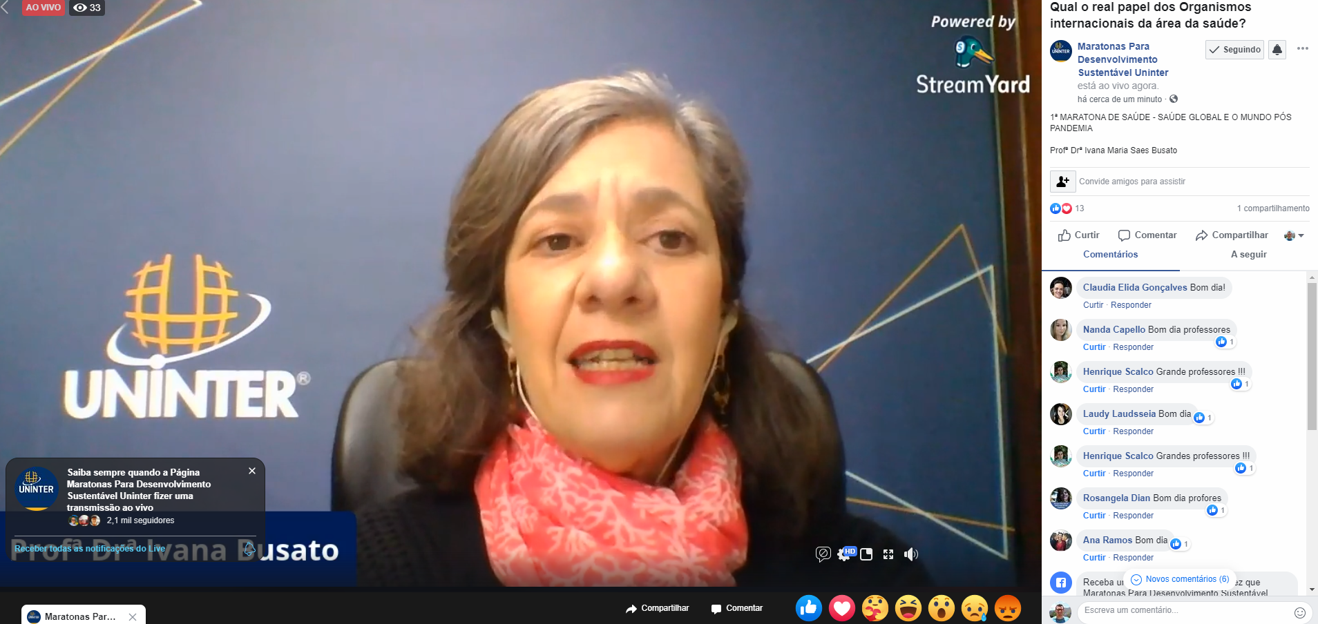 Para falar sobre a atuação de organismos internacionais na área da saúde, a professora Ivana Maria Saes Busato, da Escola de Saúde, Biociência, Meio Ambiente e Humanidades da Uninter, participou da 1ª Maratona de Saúde Global e o Mundo Pós-Pandemia, em transmissão ao vivo pela página Maratonas para desenvolvimento sustentável Uninter, na sexta-feira (21.ago.2020). Sua fala buscou responder à pergunta “Qual o real papel dos organismos internacionais da área da saúde?”, e teve a mediação do professor Rodrigo de Cássio da Silva, coordenador do curso de Gestão Ambiental.