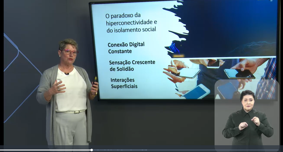 No primeiro dia, a professora e terapeuta ocupacional Vanessa Bober, da Escola Superior de Saúde Unica (ESSU), foi a responsável por uma palestra sobre a dependência digital e o impacto do uso excessivo de dispositivos eletrônicos.