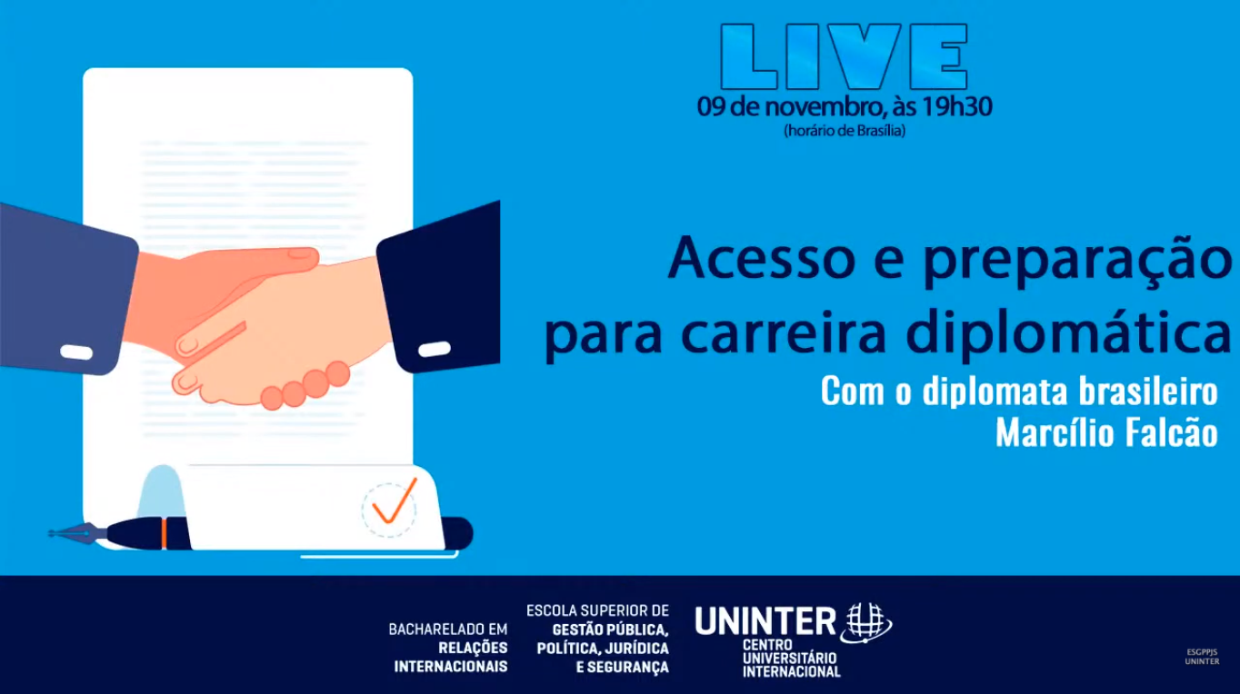 A carreira de diplomata é cercada por inspiração e receio. Sua complexidade temática e profissional parece atrair e afastar possíveis aspirantes na mesma medida. Em novembro de 2020, o curso de Relações Internacionais da Uninter recebeu o diplomata Marcílio Falcão para esclarecer o que compete a esse grupo de profissionais e quais as formas de ingressar na área.