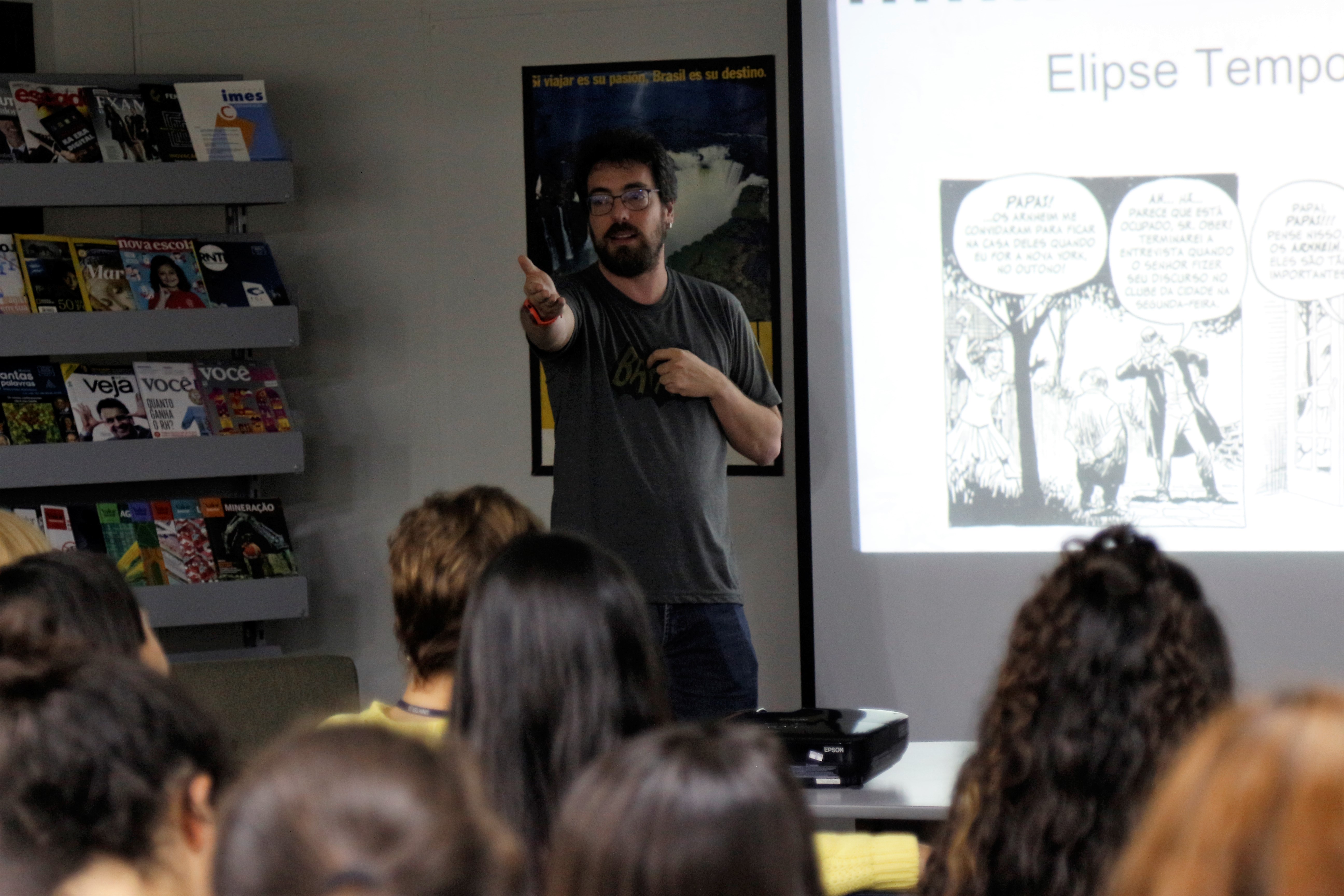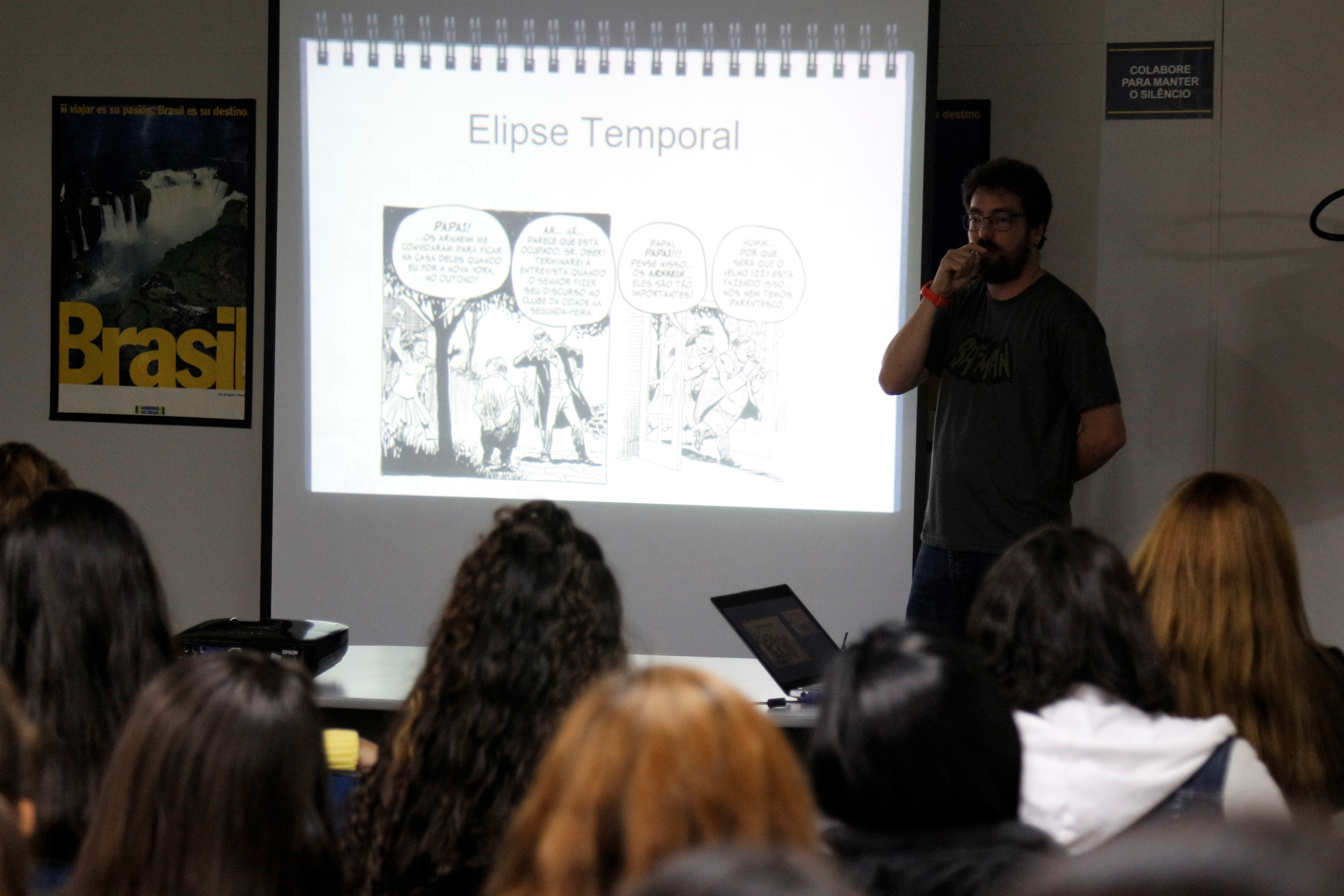 A linguagem do gibi e o que está nas entrelinhas das histórias foi o assunto tratado pelo professor Rodrigo Otavio dos Santos. Ele levantou um questionamento sobre como pensar a linguagem dos gibis. Para ele, as pessoas leem gibis da mesma forma que veem filmes, sem para pensar na forma que são construídos. Rodrigo também sugeriu que os alunos presentes utilizem os gibis, como também outros meios como o cinema para trabalhar conteúdos em sala com os alunos. “Utilizem tudo que está permeando a mente dos alunos”, recomenda.