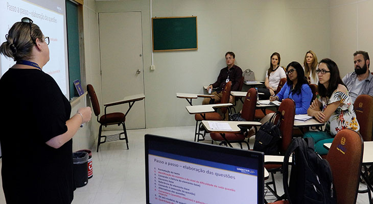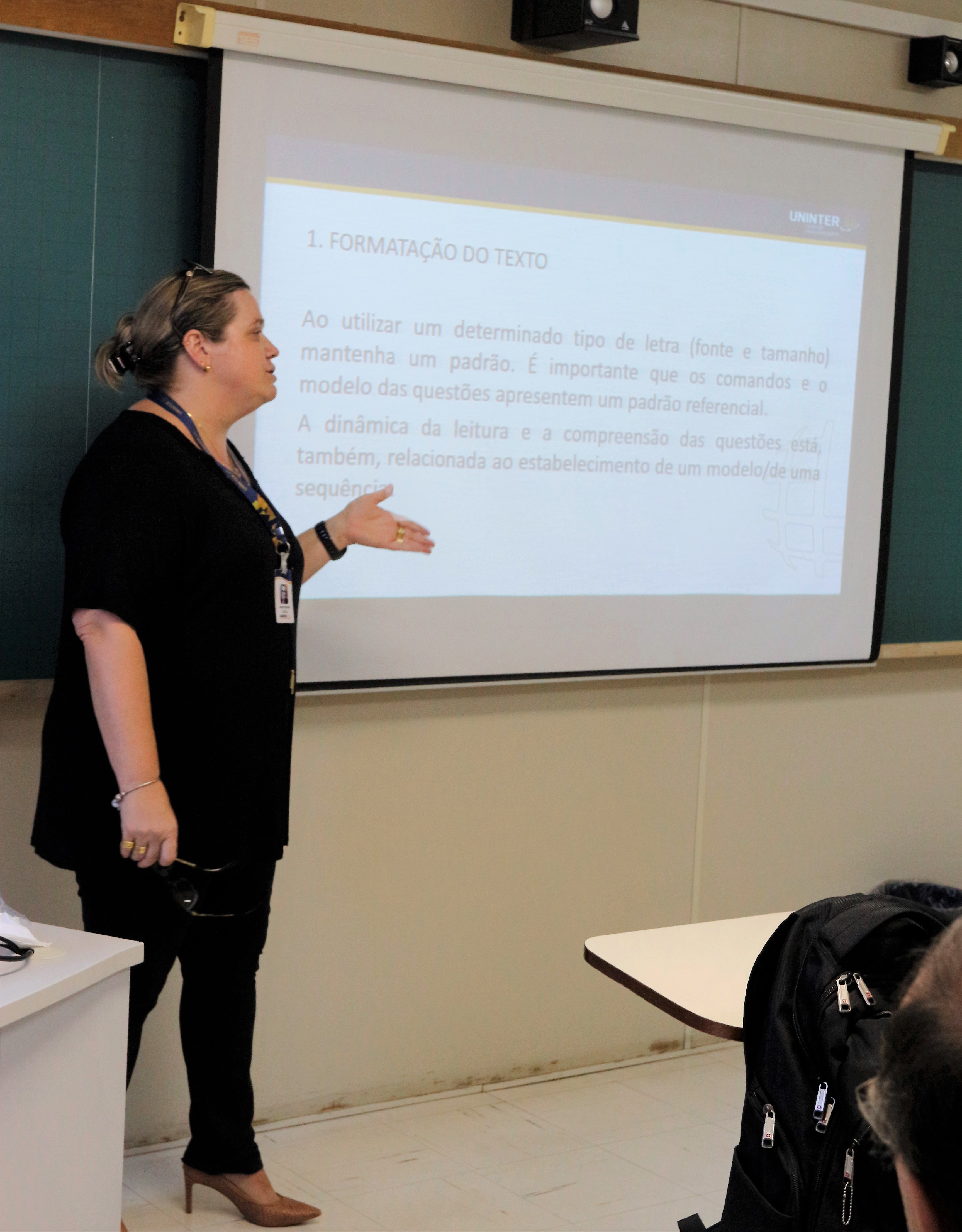 De tamanha importância para a avaliação dos cursos e para que o Ministério da Educação possa promover melhorias no ensino, as provas do Enade seguem sempre um modelo que de tempos em tempos é atualizado. Para que os professores da Uninter se mantenham atualizados a respeito do assunto, a coordenadora do Setor de Avaliação da Escola Superior de Educação da instituição, Gisele Thiel, realizou a oficina “Como formular questões contextualizadas: modelo ENADE”, durante a Jornada Acadêmica, em fevereiro.