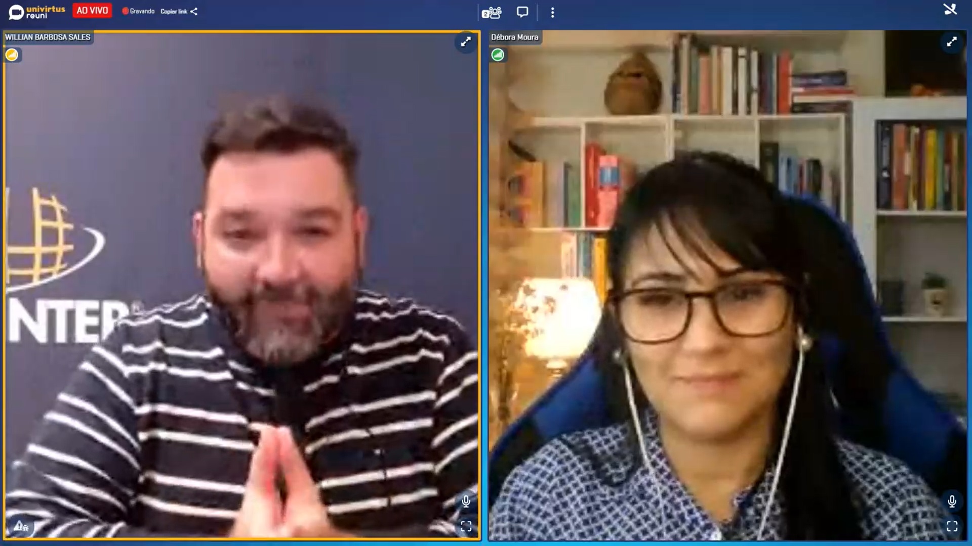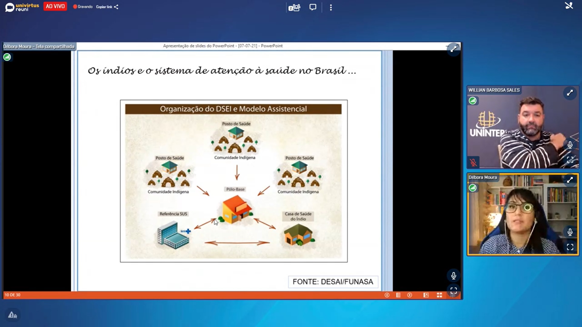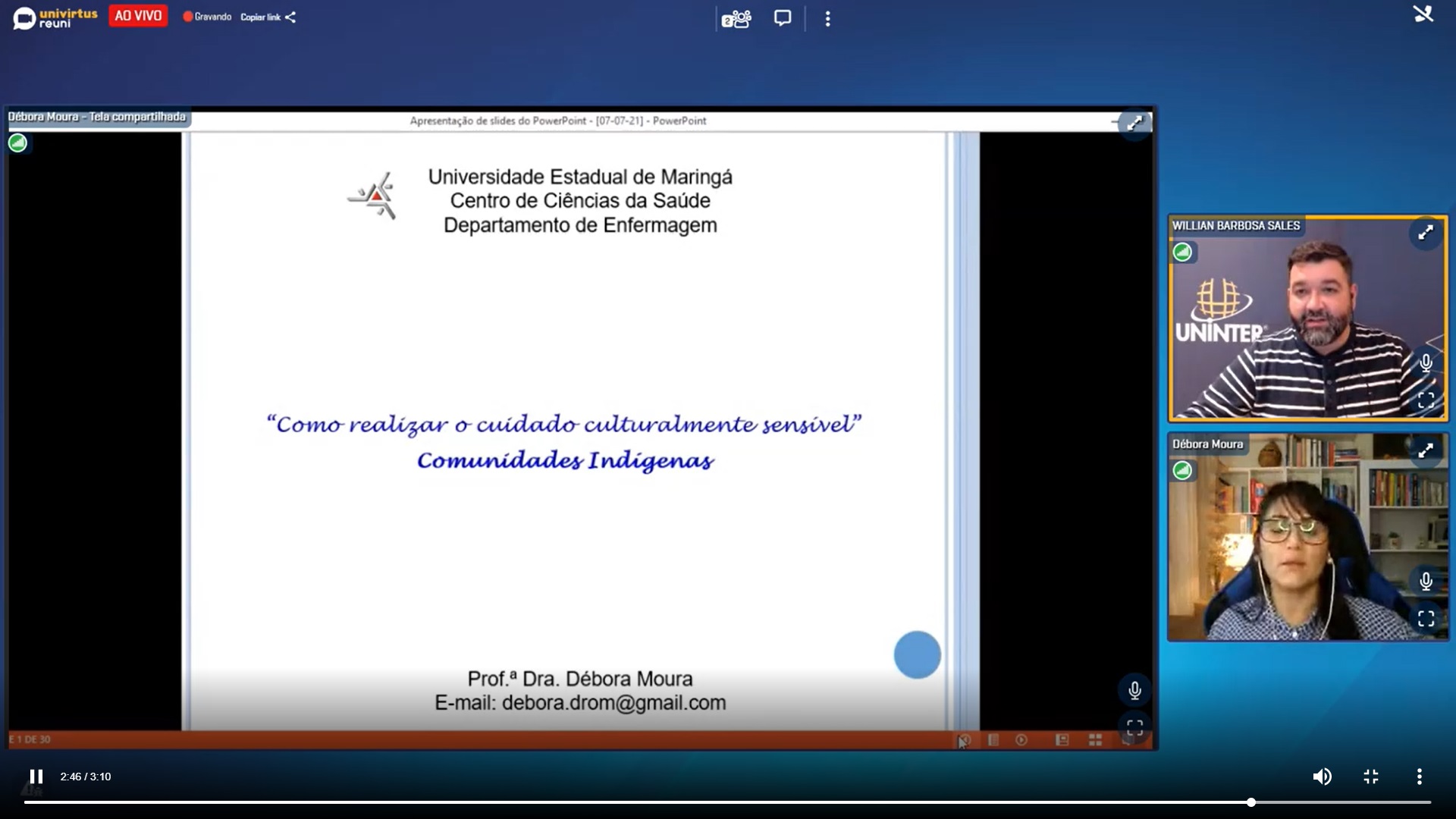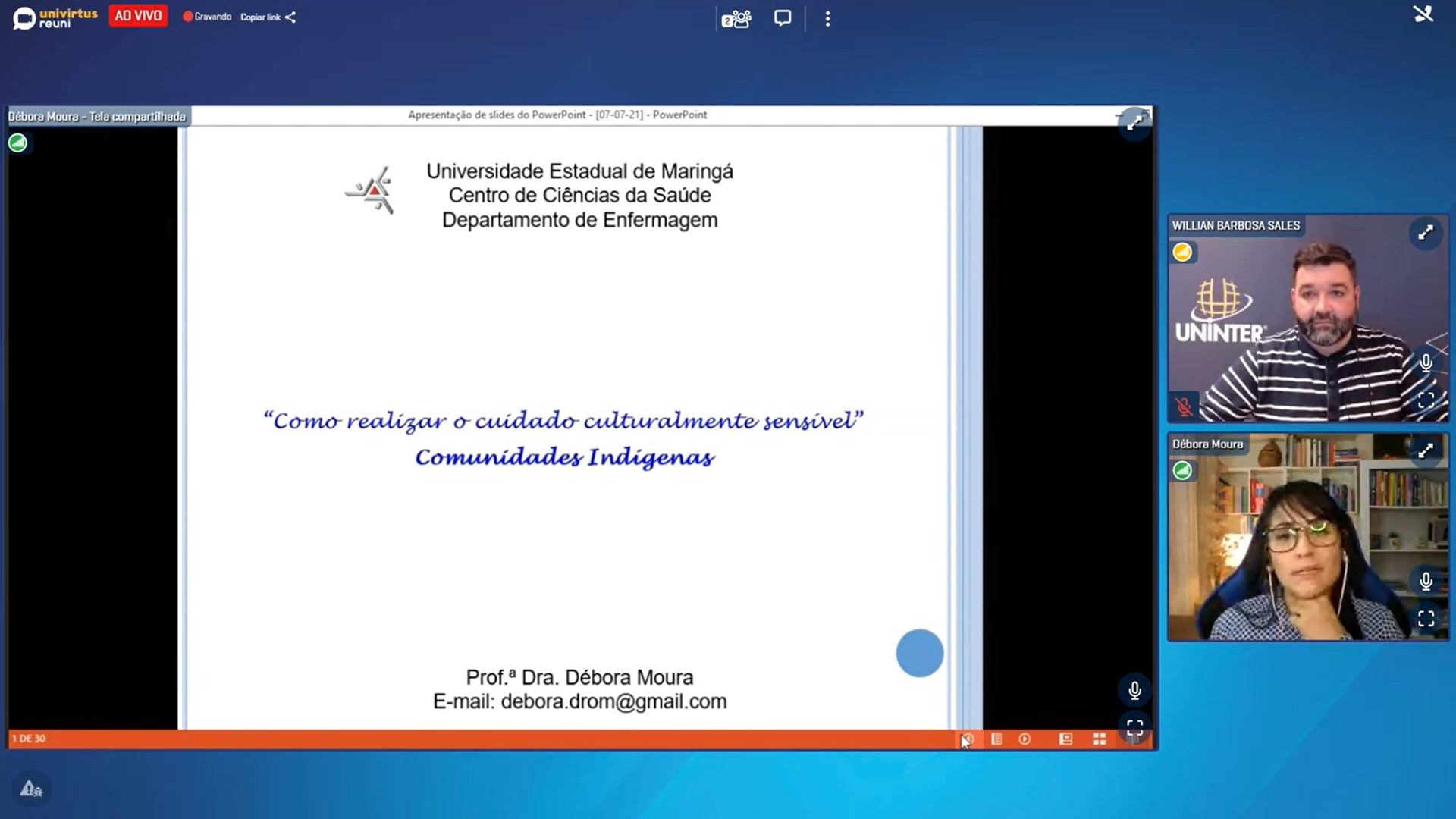 Débora participou da live Como realizar o cuidado culturalmente sensível nas comunidades indígenas, evento do programa Vem Saber, promovido pela área de pós-graduação em Saúde da Uninter. Transmitido pelo AVA Univirtus no dia 07.jul.2021, às 19h20, o evento contou com a mediação do coordenador dos cursos de pós-graduação lato sensu, professor Willian Barbosa Sales.