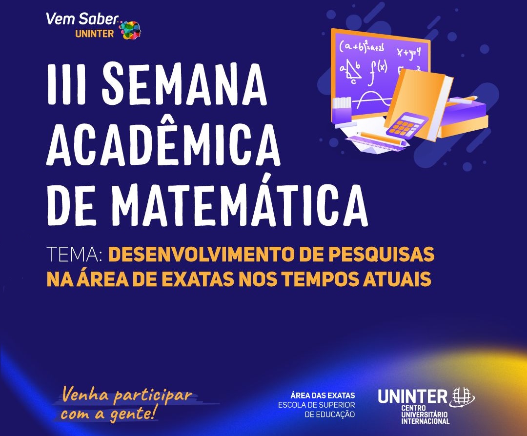 A 3ª Semana Acadêmica de Matemática da Uninter de 2023 teve como tema “Desenvolvimento de pesquisas na área de exatas nos tempos atuais”. Com transmissão ao vivo pelas páginas da Escola Superior de Educação (ESE), o evento ofertou palestras, oficinas e apresentações de trabalhos científicos aos alunos. A programação ocorreu entre os dias 8 e 10 de maio.