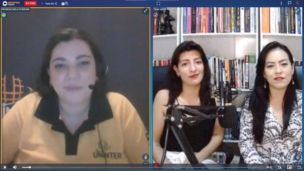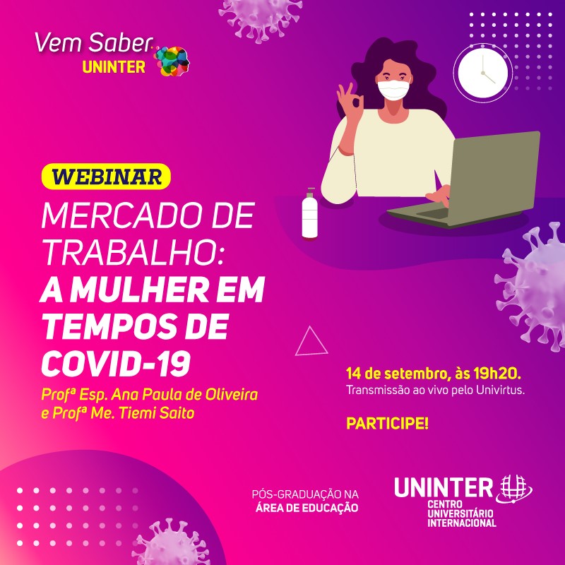 Para tratar sobre desigualdade de gênero, a webinar Mercado de trabalho: a mulher em tempos de Covid-19 foi ao ar no dia 14.09.20, pelo Univirtus. O evento foi mediado pela professora Patricia Carla Ferreira, coordenadora de cursos de pós-graduação da área de Educação, e contou com a presença da professora e advogada Ana Paula Oliveira, vice-presidente do Instituto de Defesa da Mulher no Mercado de Trabalho do Brasil, e a professora Tiemi Saito, do curso de Direito da Uninter.