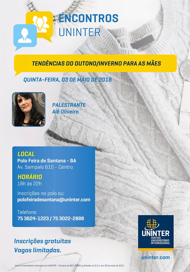 Para quem tem dúvidas sobre como se vestir, a estilista e empreendedora Alê Oliveira realiza palestra nesta quinta-feira (3), às 18h, no polo de apoio presencial da Uninter em Feira de Santana (BA). A intenção do encontro é, além de oferecer dicas sobre estilo, celebrar o Dia das Mães e lembrar à comunidade da importância de entender a data como uma comemoração mais ampla.