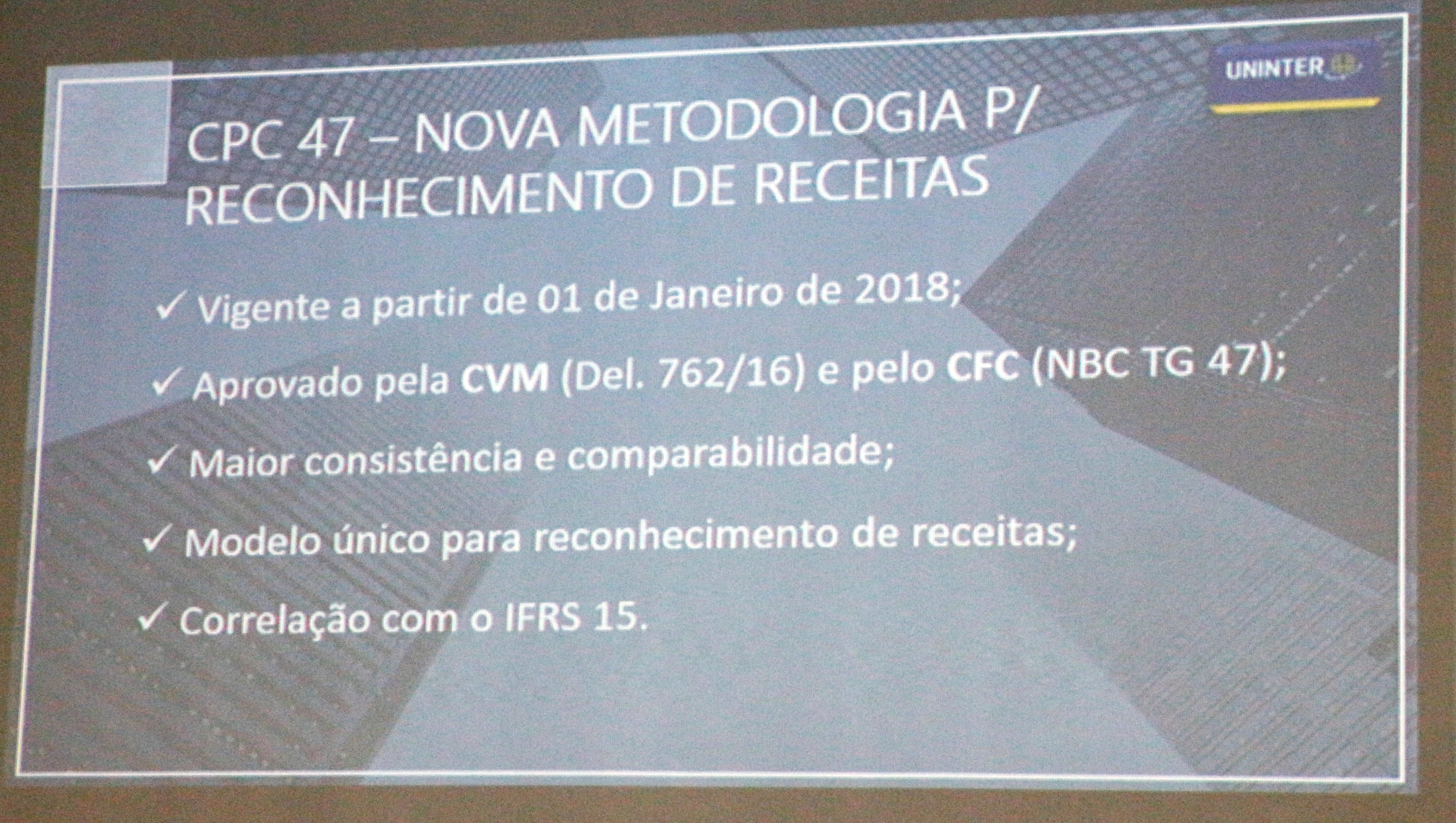 No último dia 20 de setembro, os alunos do 3° ao 8° período do curso de Ciências Contábeis da Uninter participaram de uma palestra no campus Tiradentes sobre as atualizações no reconhecimento de receitas do Comitê de Pronunciamentos Contábeis (CPC 47).