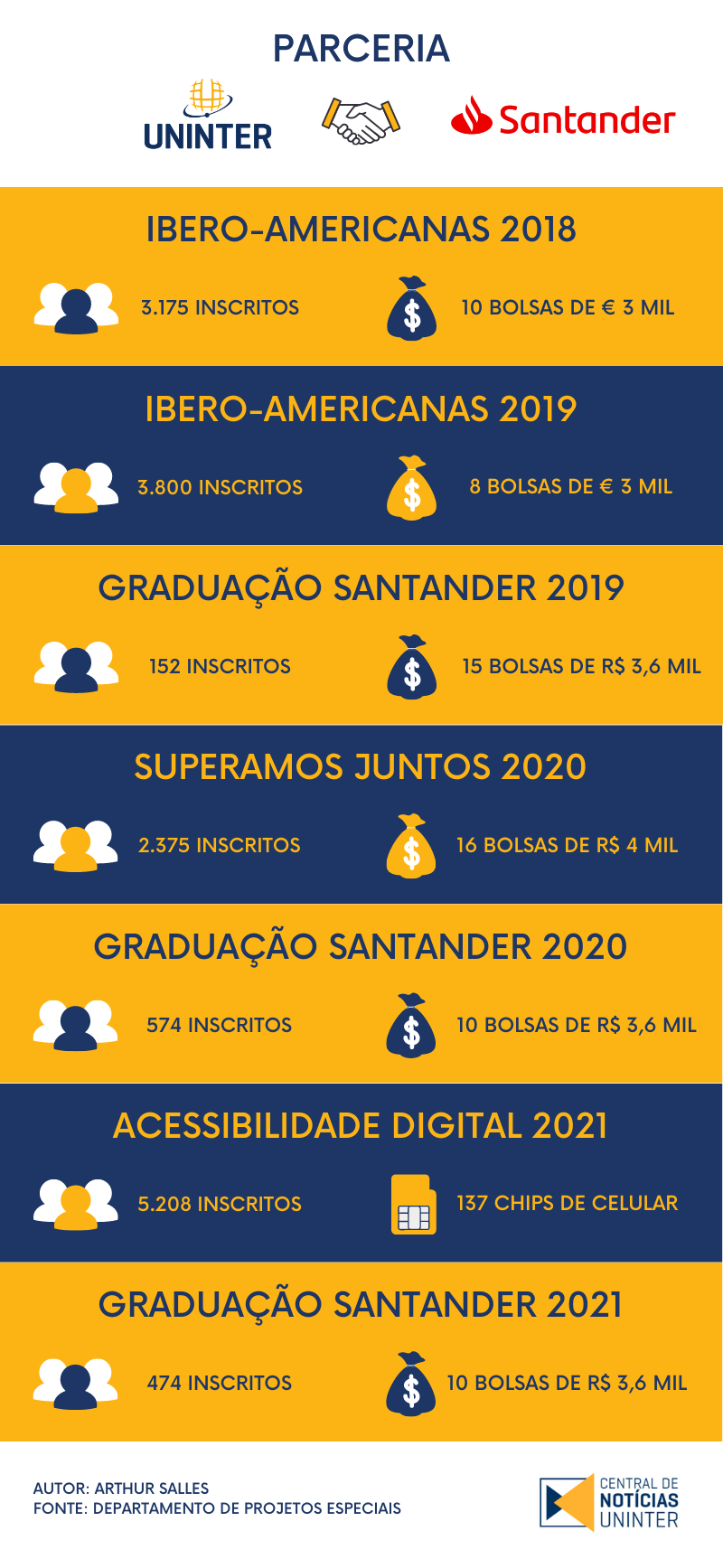 Uma parceria de sucesso é capaz de impulsionar a vida acadêmica de centenas de alunos. A Uninter e o Banco Santander vêm desde 2018, após seis anos de parcerias de bolsas de intercâmbio, promovendo projetos de auxílios financeiros e estudantis aos acadêmicos do centro universitário. Já foram 206 estudantes contemplados desde então, com previsão de pelo menos mais 22 até setembro deste ano com a nova edição do programa Santander Superamos Juntos.