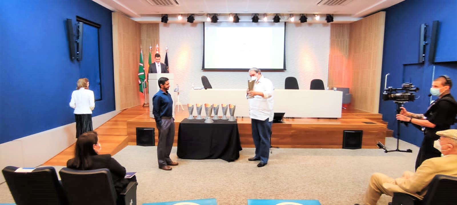 Entre os 96 projetos inscritos no 1º Prêmio Top Inovação, 7 foram na categoria meio ambiente e sustentabilidade. Na fase final, Alisson Diógenes, de Curitiba (PR), conquistou o prêmio da categoria com o desenvolvimento de uma solução sanitizante ambientalmente correta, pensado para o contexto da pandemia de Covid-19. “É sensacional estar de volta à Uninter, ainda mais para receber um prêmio tão importante”, afirma Alisson, que em 2015 foi coordenador do curso de Engenharia Elétrica. Na foto em destaque, Diógenes recebe o troféu das mãos de Wilson Picler.