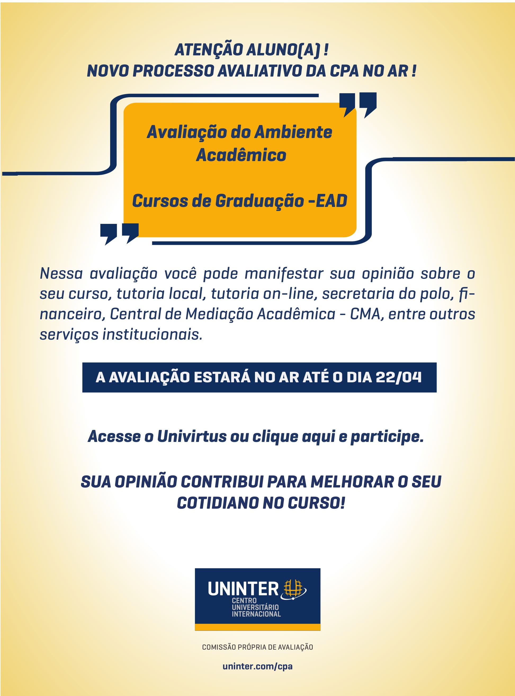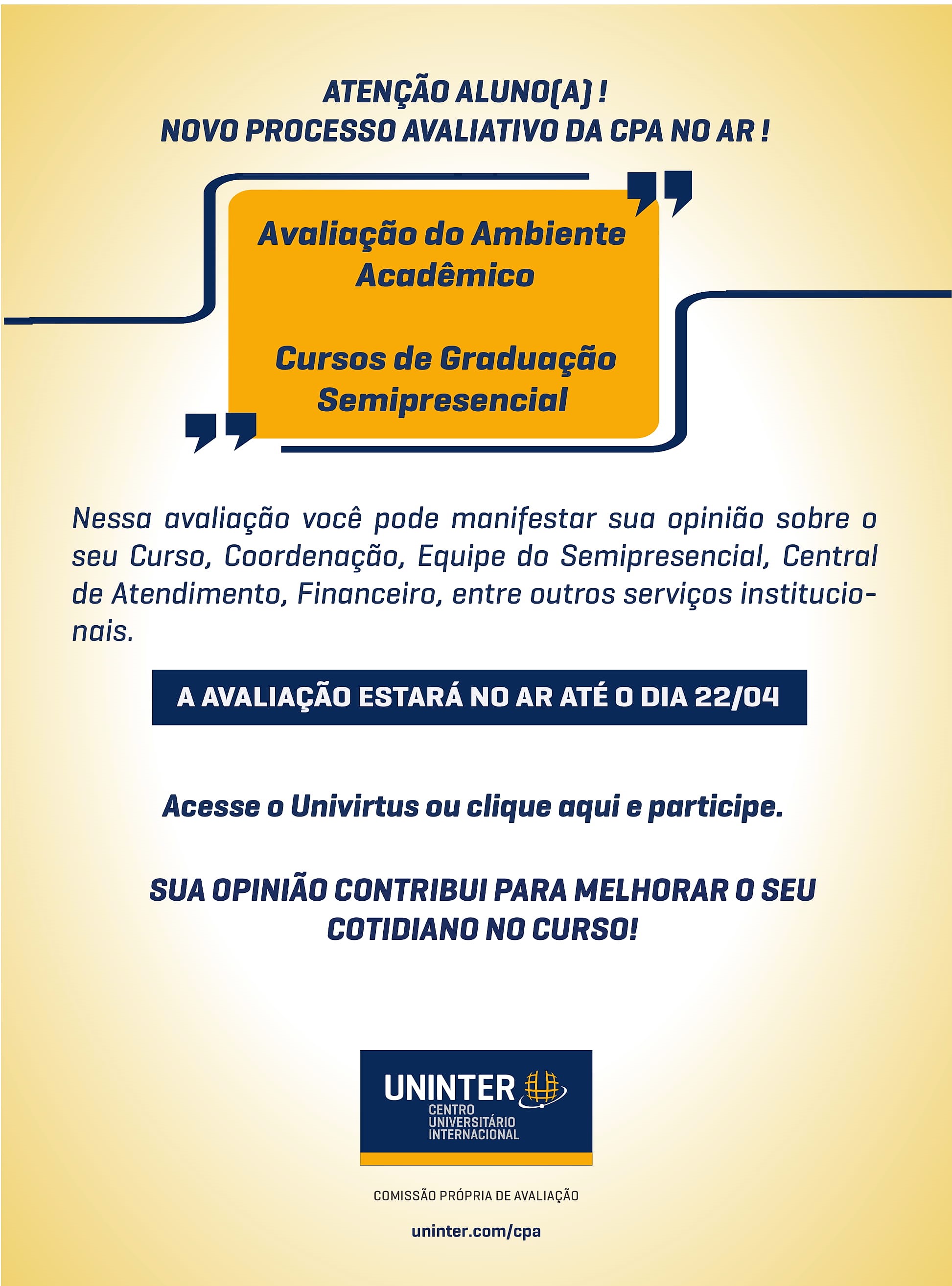 A Comissão Própria de Avaliação (CPA) da Uninter disponibilizou na última quarta-feira (11) uma nova pesquisa com o objetivo de melhorar o cotidiano dos alunos da instituição. A avaliação é destinada aos alunos do módulo presencial, semi-presencial e de educação a distância, e se encontra disponível no Univirtus.