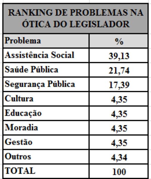 A metodologia que utilizamos consistiu em analisar qualitativamente cada proposição legislativa referente a essa população, buscando identificar os problemas que a proposição visava resolver. Na ótica do legislador, considerando toda a 55ª Legislatura, o maior problema referente à pessoa em situação de rua foi o relacionado à assistência social (39,13%). O segundo maior problema foi saúde pública (21,74%). E em terceiro lugar ficou a segurança pública (17,39%).