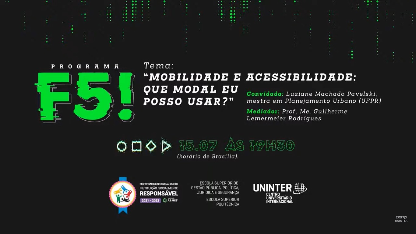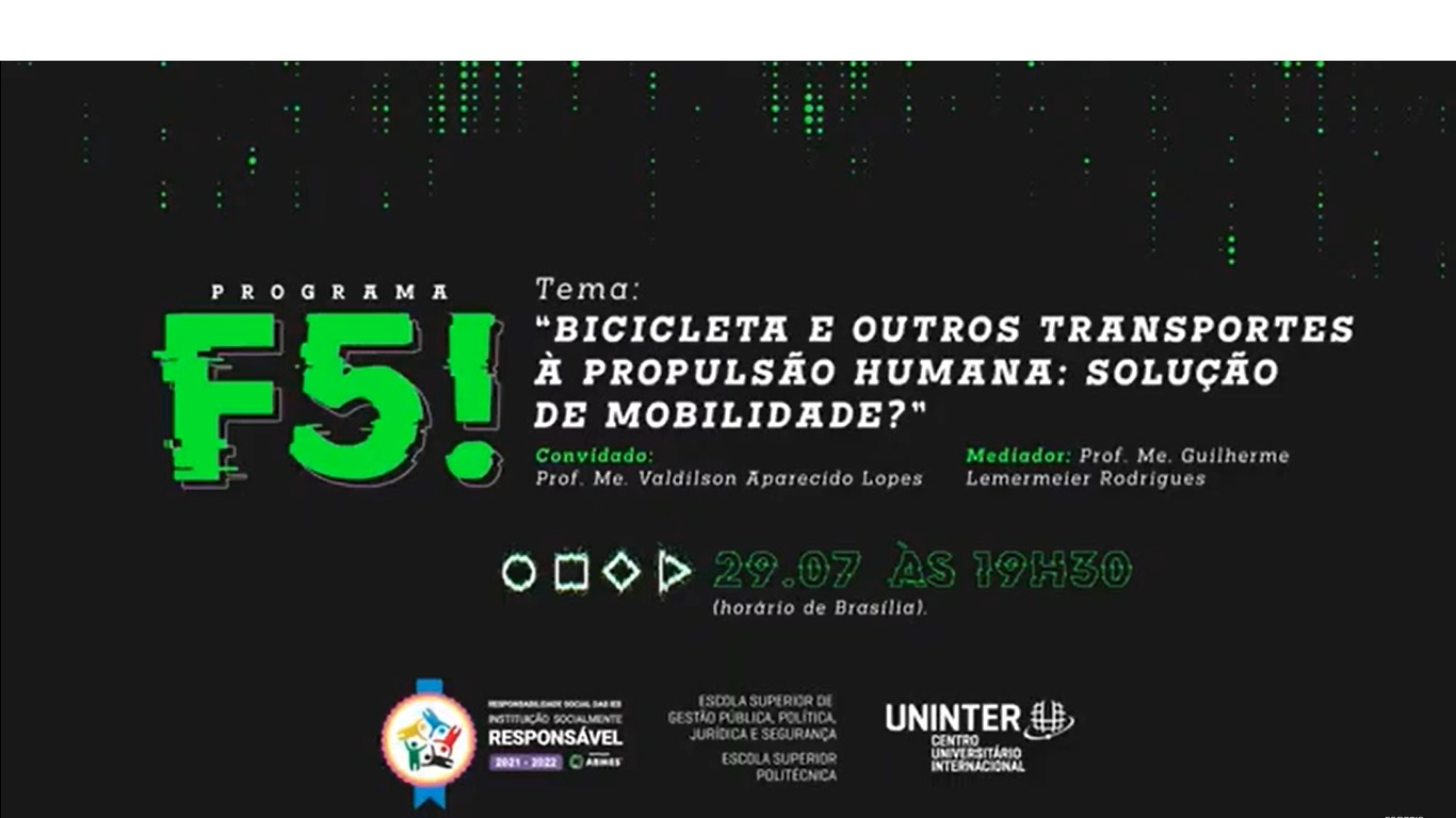Os profissionais debateram sobre os temas “Mobilidade e acessibilidade: qual modal posso usar?” e “Bicicleta e outros transportes à propulsão humana: Solução de mobilidade?” nas edições do Programa F5, apresentado pelo professor Guilherme em uma parceria da ESP com a Escola Superior de Gestão Pública, Política, Jurídica e Segurança (ESGPPJS) da Uninter.