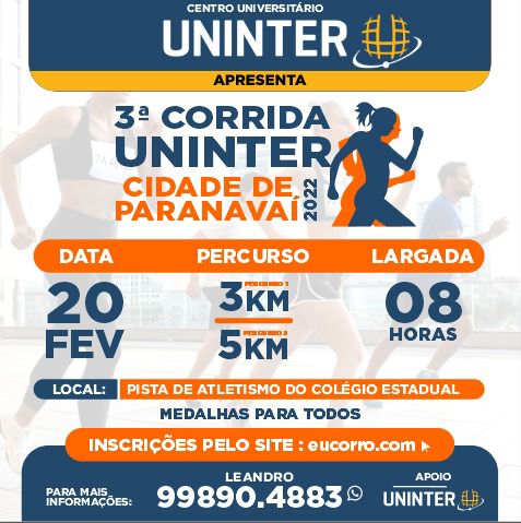 Às 8h do dia 20 de fevereiro, na pista de atletismo do Colégio Estadual, acontecerá a 3ª Corrida Uninter – Cidade de Paranavaí 2022. De acordo com Daniel Lucio Ferrarese, gestor do polo local, são esperadas mais de 150 pessoas, as quais poderão escolher percursos de 3 a 5km.
